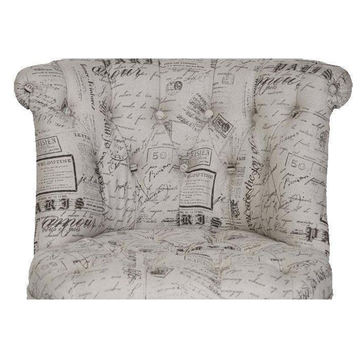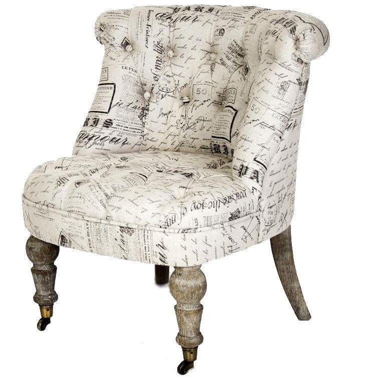Stile chic francese e versatilità! Le dimensioni compatte della poltrona pantofola con scritta francese la rendono perfetta come poltrona da toeletta o come seduta aggiuntiva nel soggiorno. Questa bellezza è rivestita con un motivo nero su bianco in stile scrittura francese su lino naturale trapuntato.