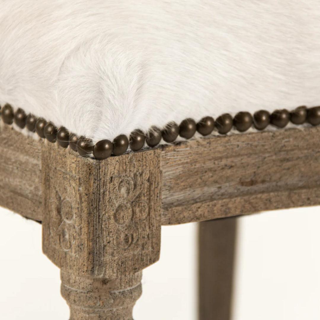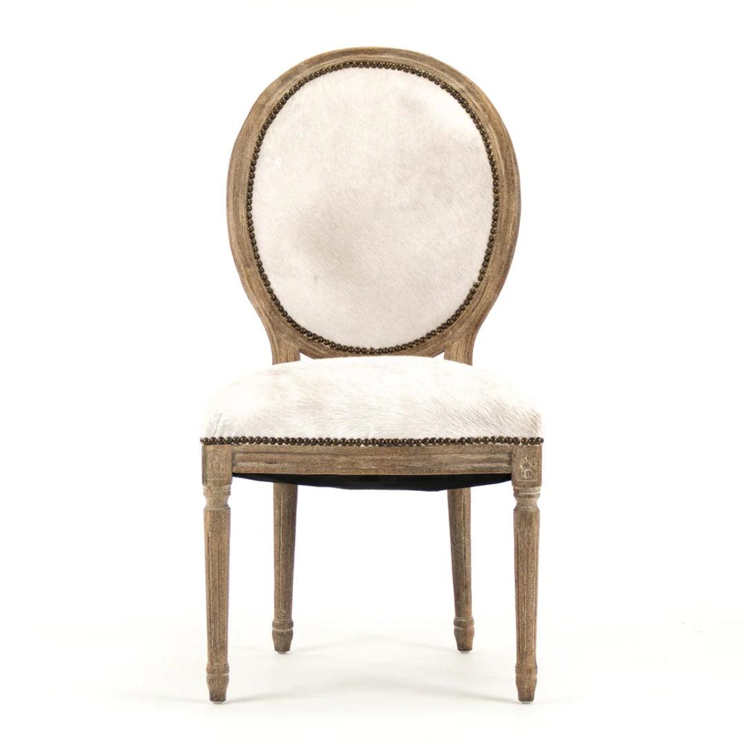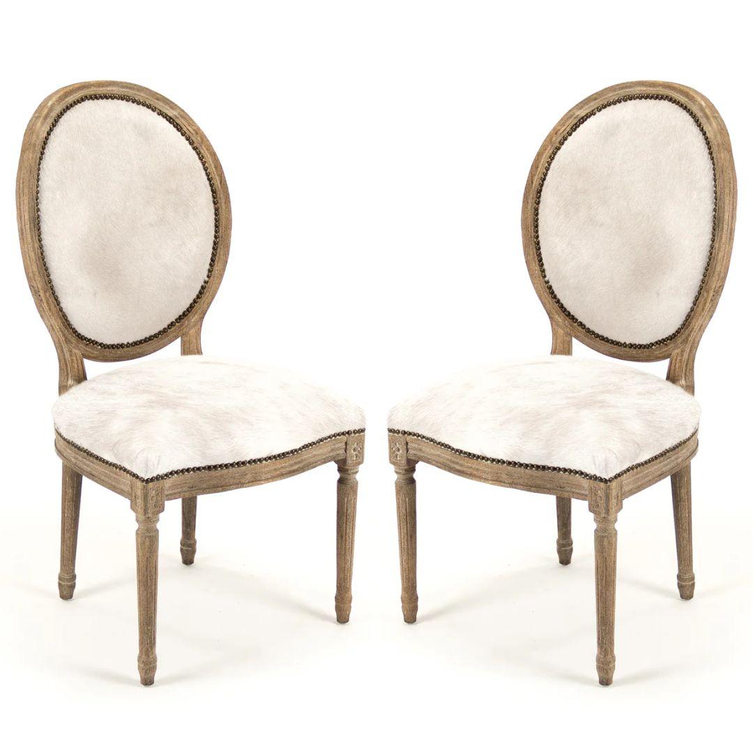 Volete che la vostra sala da pranzo sia davvero elegante e speciale? Guardate queste fantastiche sedie. Si chiamano "Sedie da Pranzo Bianche in Pelle di Mucca Brasiliana" e sono semplicemente bellissime. Hanno una struttura in legno ben realizzata, con un aspetto elegante e leggermente anticato, che lascia intravedere le linee del legno. Lo schienale e la seduta sono rivestiti in vera pelle di mucca bianca! Crea un mix di sensazioni e aspetto davvero sorprendente, come se ogni sedia fosse un'opera d'arte. Essendo in vera pelle di mucca, ogni sedia è diversa, con le sue fantasie. Aggiunge un tocco selvaggio, ma in modo elegante, a qualsiasi stanza. E se guardate attentamente, ci sono piccoli chiodi decorativi lungo i bordi della pelle di mucca, che è un bel tocco d'epoca.