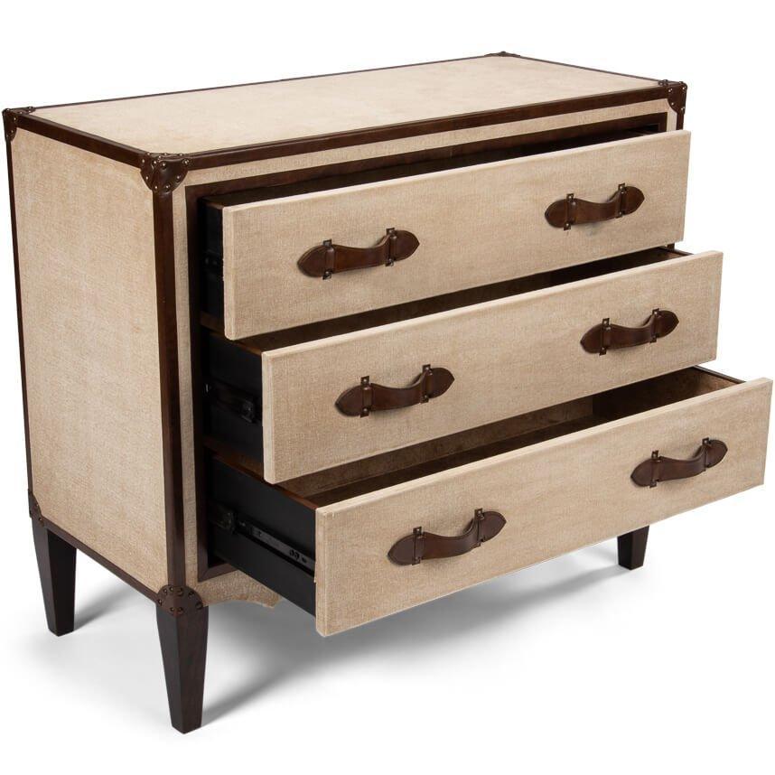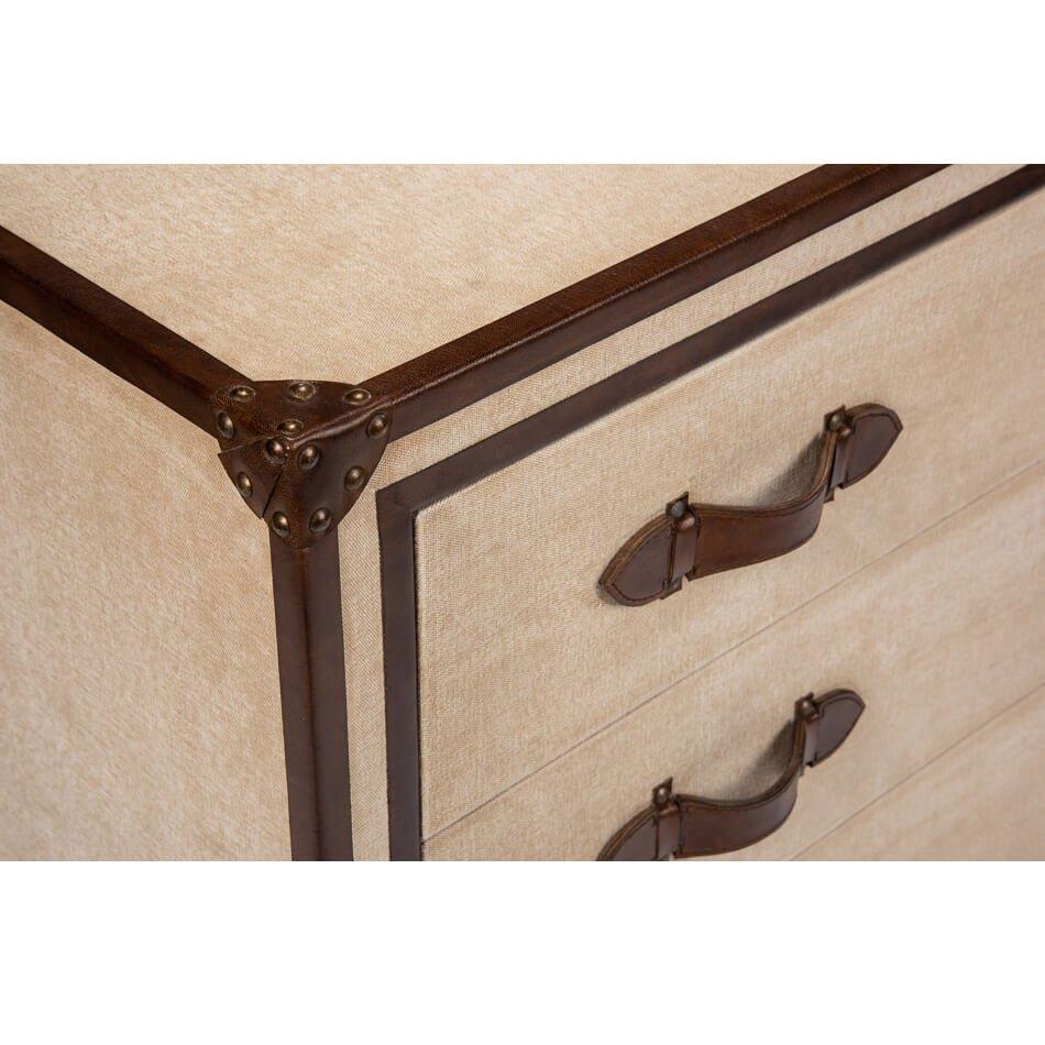 Questa cassettiera in tela Art Déco francese è un'aggiunta di stile alla vostra camera da letto. La struttura in legno presenta un rivestimento in tela con finiture e maniglie in pelle per uno stile regale. Questo mobile in stile ranch ha tre cassetti per un ampio spazio di archiviazione, così potrete organizzare i vostri vestiti. Il colore beige si abbina ai dettagli in pelle marrone per un look pulito e di carattere.
