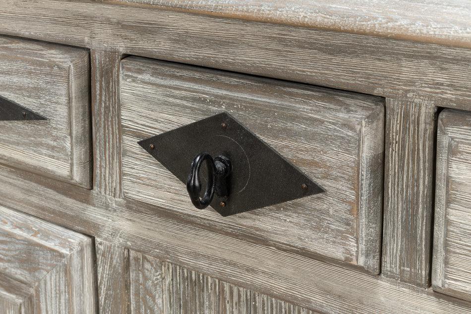 Le piastre frontali e le maniglie in ferro battuto a mano, realizzate su misura, valorizzano e valorizzano la credenza Moonbeam Diamond Drawer Buffet dalle dimensioni perfette. Realizzata in legno massello con due ante e tre cassetti nell'esclusiva finitura Moonskin, questa credenza unica è un elemento d'arredo di grande impatto in ambienti montani, costieri o in qualsiasi altro ambiente in cui sia richiesto un arredamento classico.