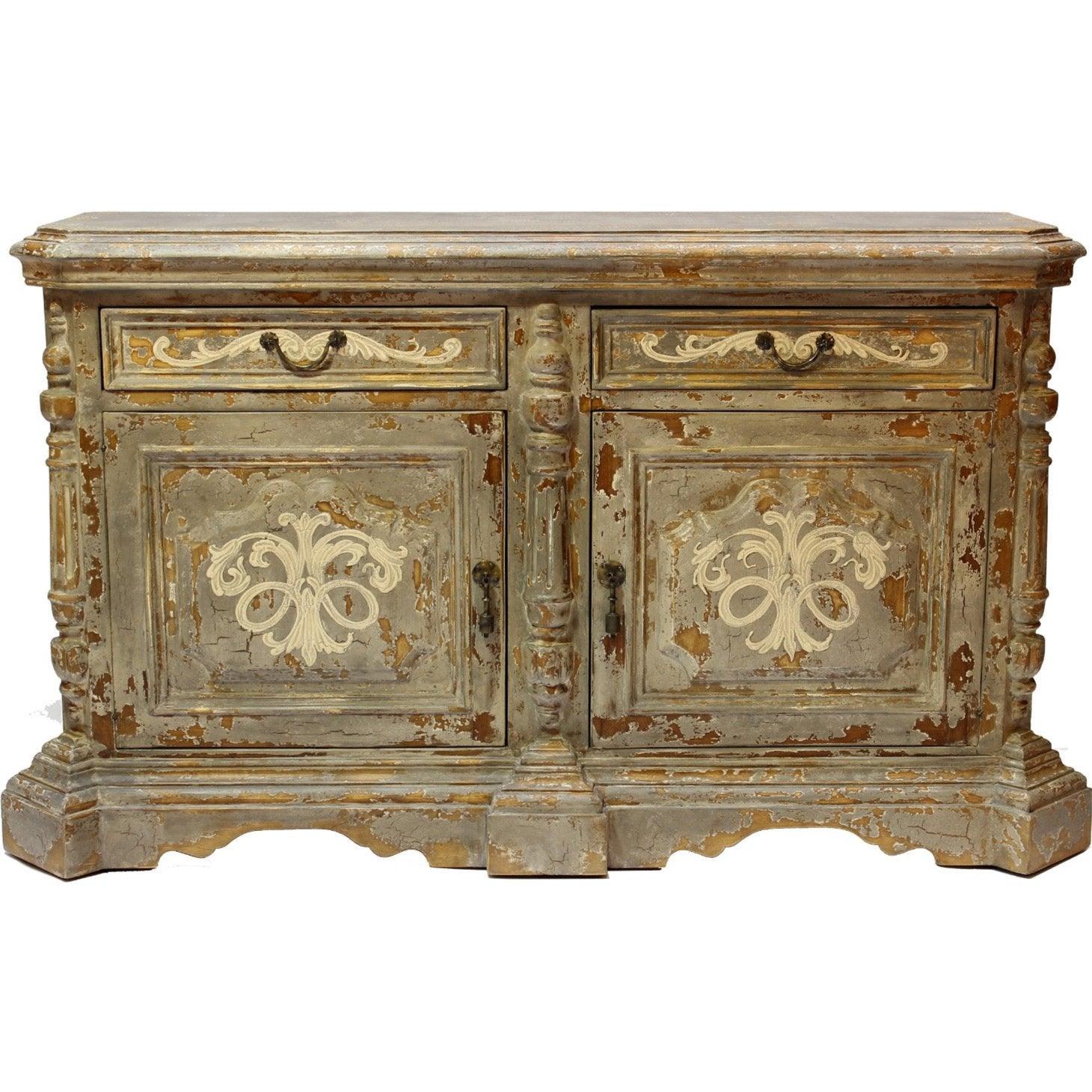 La pesante antichità e le splendide decorazioni intagliate a mano conferiscono a questa credenza dipinta in stile villa spagnola l'aspetto di un prezioso pezzo d'antiquariato. Realizzata in mogano massello e ricca di splendidi dettagli, questa credenza presenta due cassetti superiori per nascondere piccoli oggetti e una coppia di ante che si aprono completamente per rivelare un interno spazioso per riporre biancheria, zuppiere e altri oggetti essenziali. I motivi dipinti a mano aggiungono un tocco di delicatezza, mentre la finitura grigio anticato conferisce un'atmosfera rilassante. Le ferramenta anticate sono il tocco finale perfetto.
