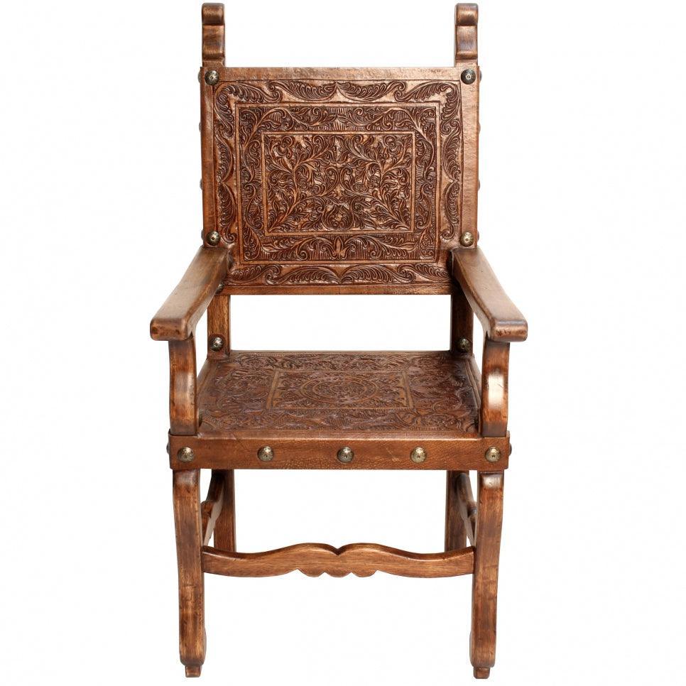 La poltrona da pranzo Regal in pelle lavorata impreziosirà la vostra sala da pranzo con il suo aspetto unico. Motivi lavorati a mano impreziosiscono la seduta e lo schienale in pelle, mentre grandi borchie metalliche impreziosiscono la base, conferendole un tocco di ispirazione spagnola. Una finitura marrone completa il look in stile villa, rendendo questo pezzo facile da integrare nella vostra palette di colori.