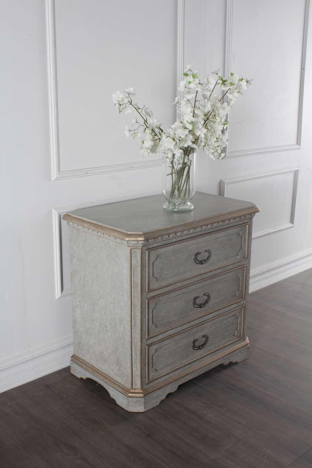 Il comodino francese a 3 cassetti Maurice grigio valorizzerà l'arredamento della tua camera da letto o del tuo soggiorno. Questo comodino in legno presenta eleganti bordi e texture intagliati a mano che donano dimensione e stile. Le maniglie in ferro sono splendide, mentre la finitura grigia è accogliente e accattivante. Riponi tutto l'essenziale nei tre cassetti.