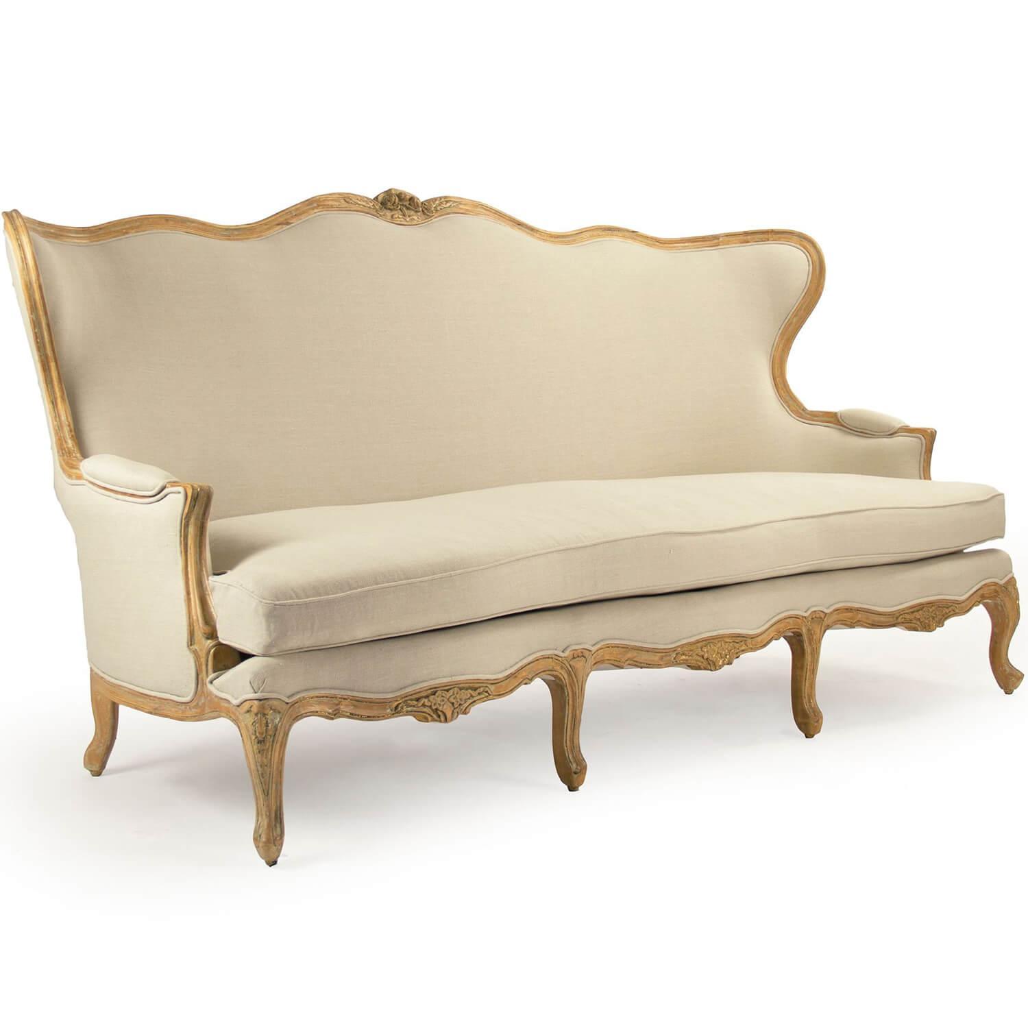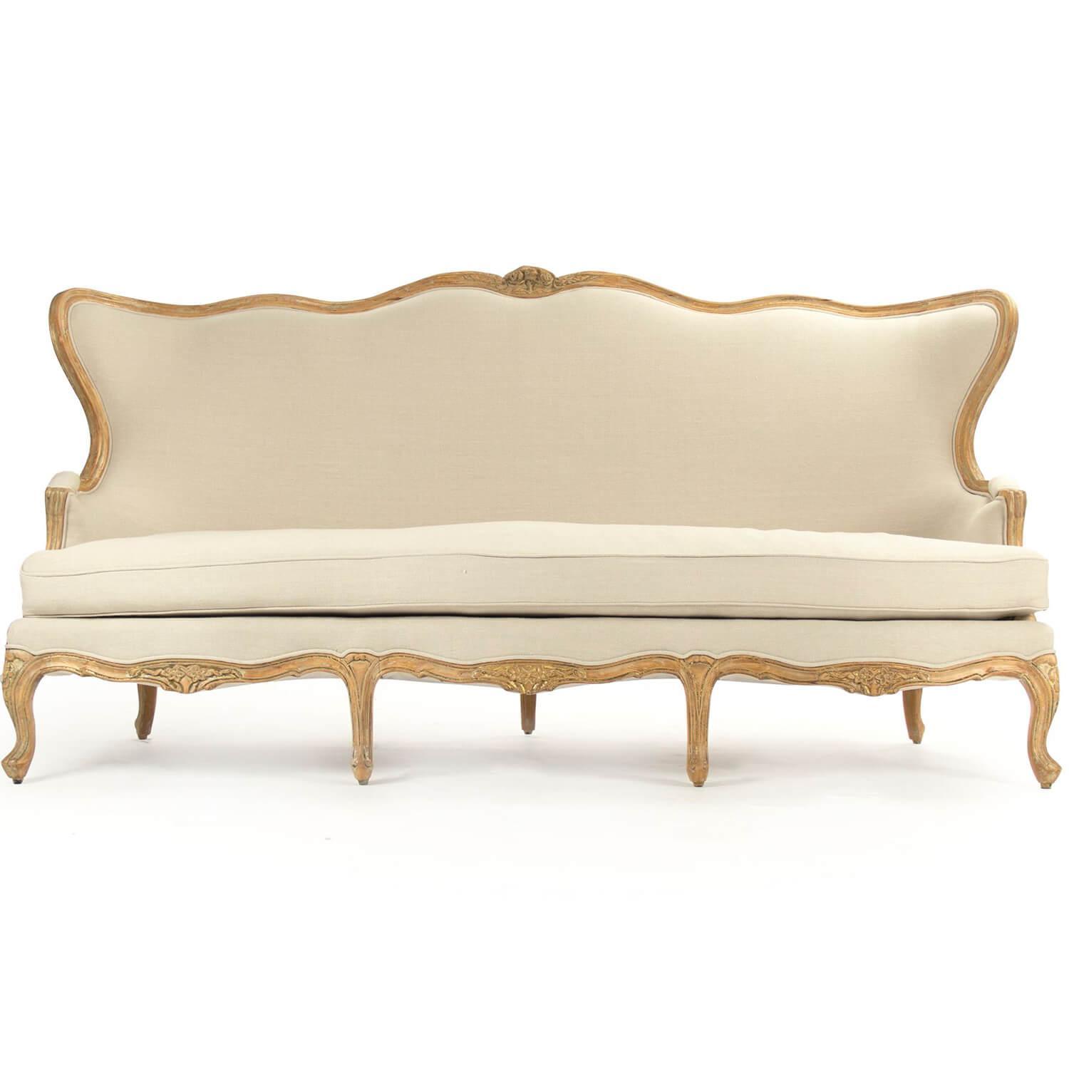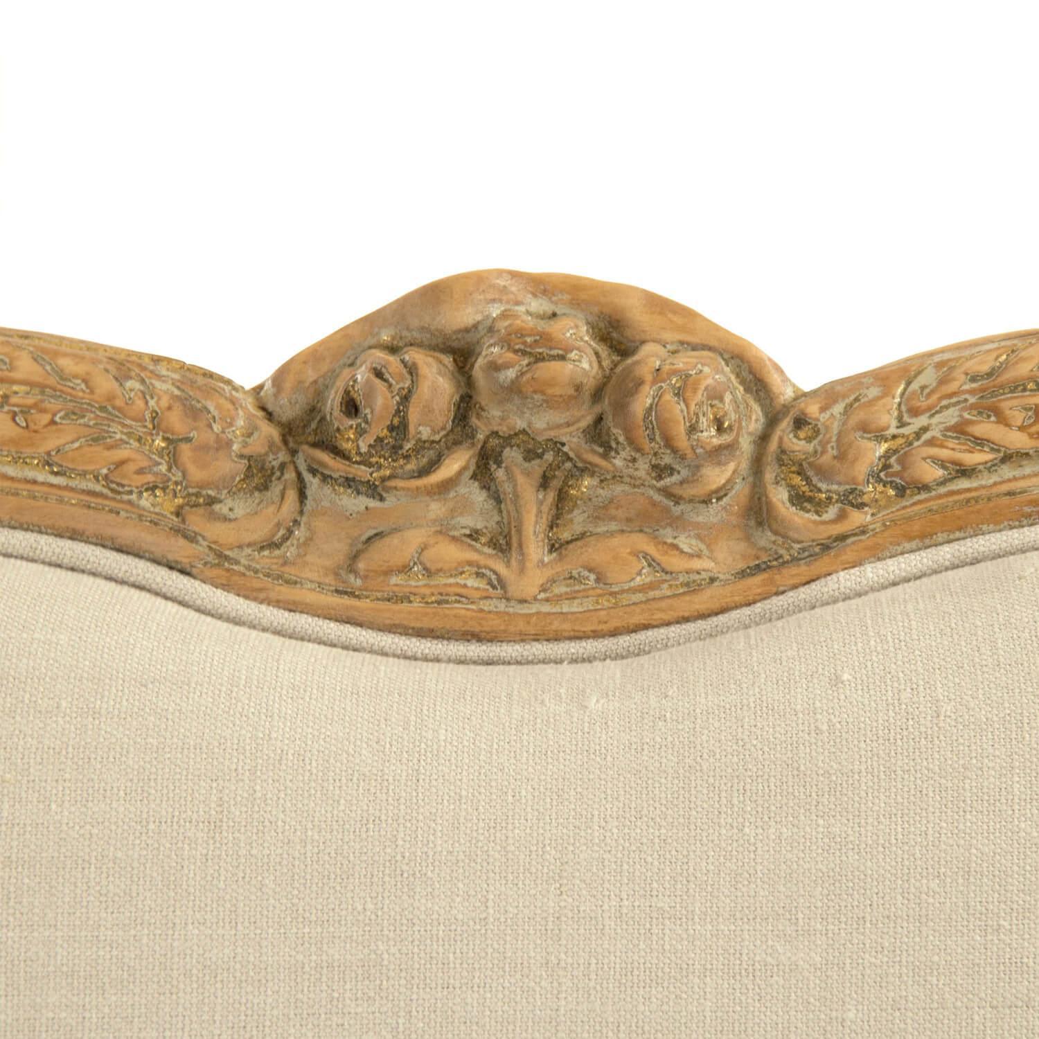 Le curve aggraziate conferiscono a questo divano provenzale francese una presenza sofisticata, rendendolo il complemento perfetto per altri arredi ispirati alla Provenza. Motivi floreali squisitamente intagliati adornano il grembiule, lo schienale e le gambe cabriole, rifiniti in una tonalità naturale e leggermente anticati per amplificare il fascino del divano. L'elegante rivestimento in lino naturale conferisce al divano un aspetto sofisticato e semplice.