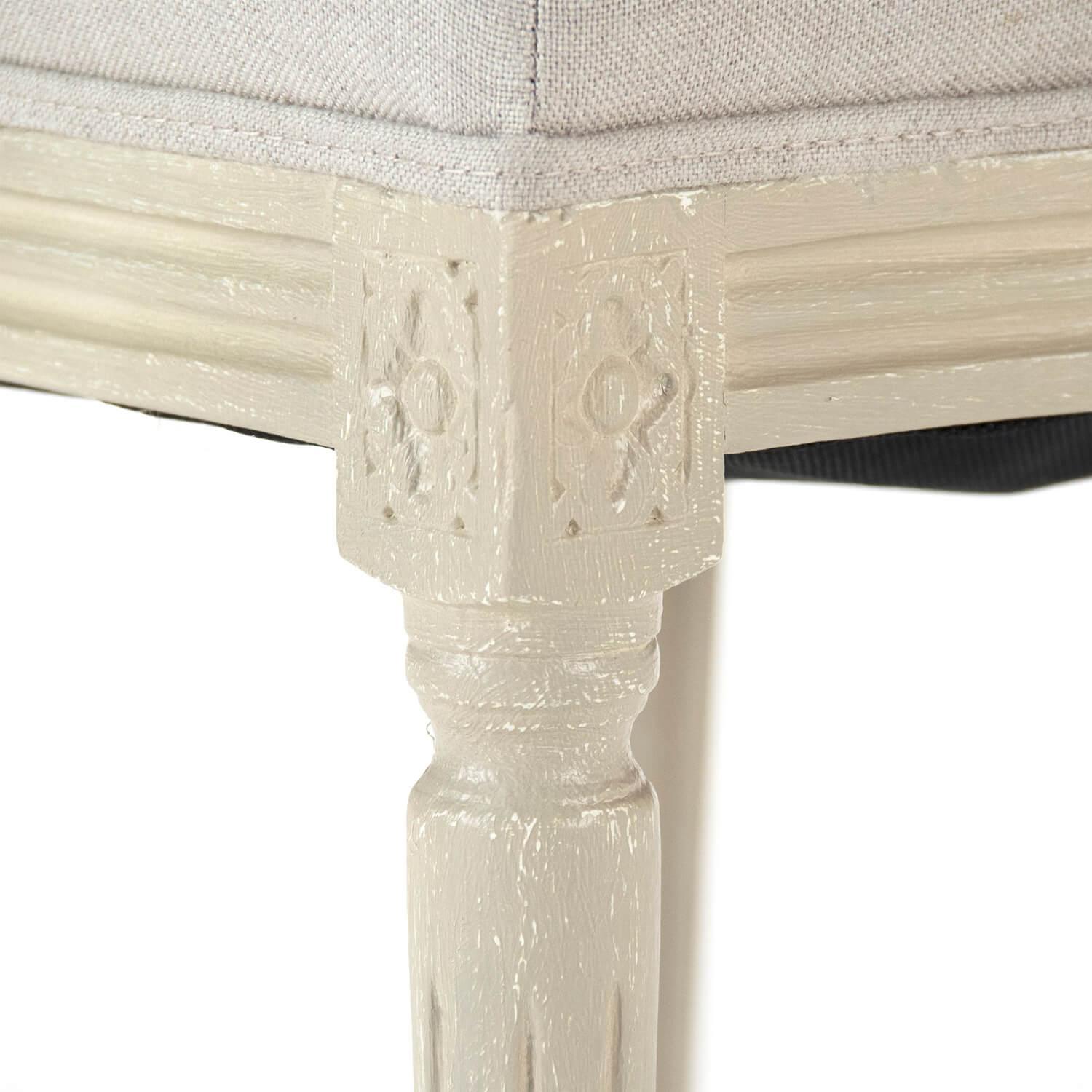 • Cornici in legno intagliate a mano con classici dorsi a medaglione • Finitura crema su legno • Sedili imbottiti in morbido lino