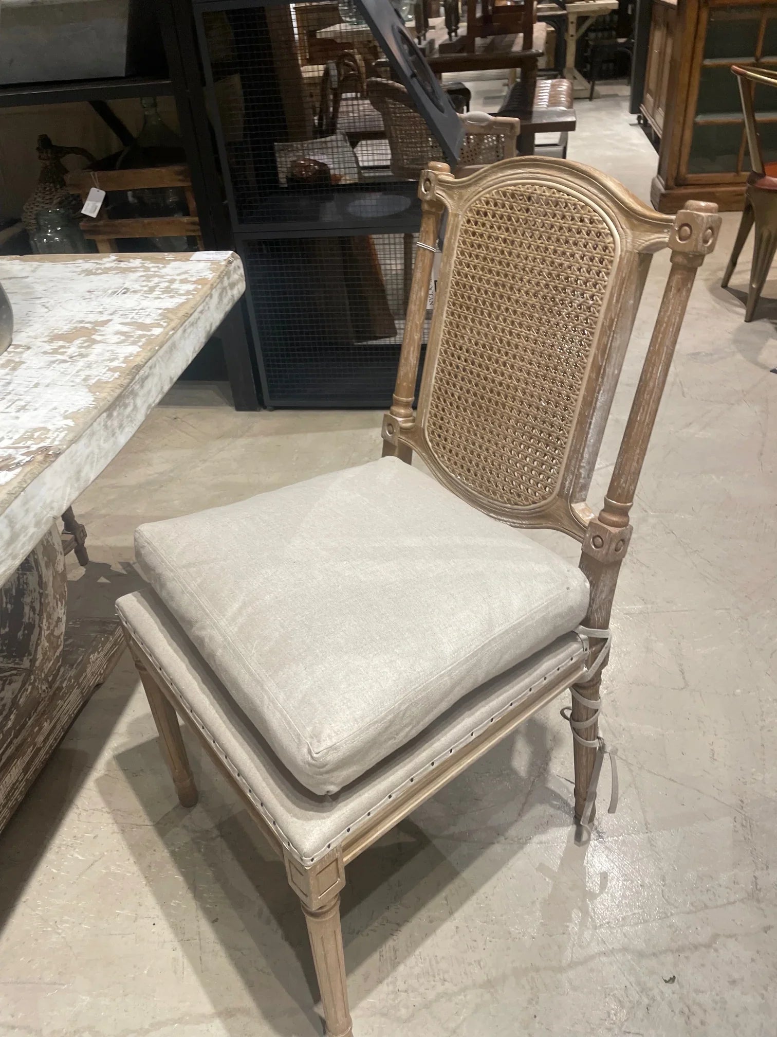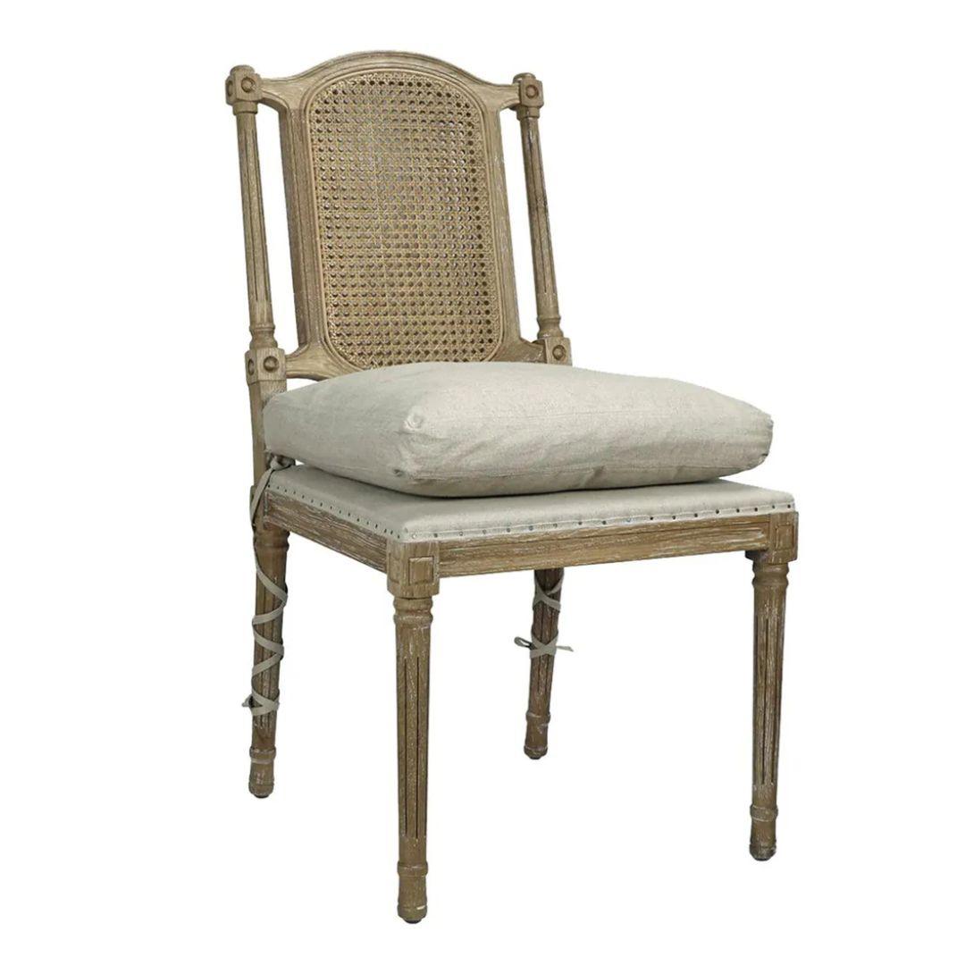 Le sedie con schienale in canna francese L'Opera sono realizzate a mano in legno massello. Presentano uno schienale in canna intrecciata e comodi cuscini beige fissati da lacci che avvolgono in modo decorativo le gambe. Queste sedie da pranzo con schienale in canna completano una zona salotto se posizionate in coppia di fronte a un divano. Sono perfette anche come capotavola.