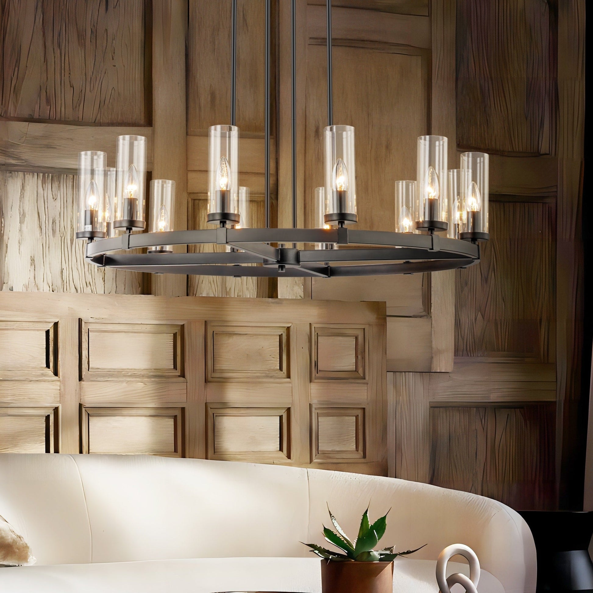 Lampadario a ruota di carro in vetro trasparente con cilindro in stile Mid-Century Modern, 12 luci, grande lampadario color oro/nero