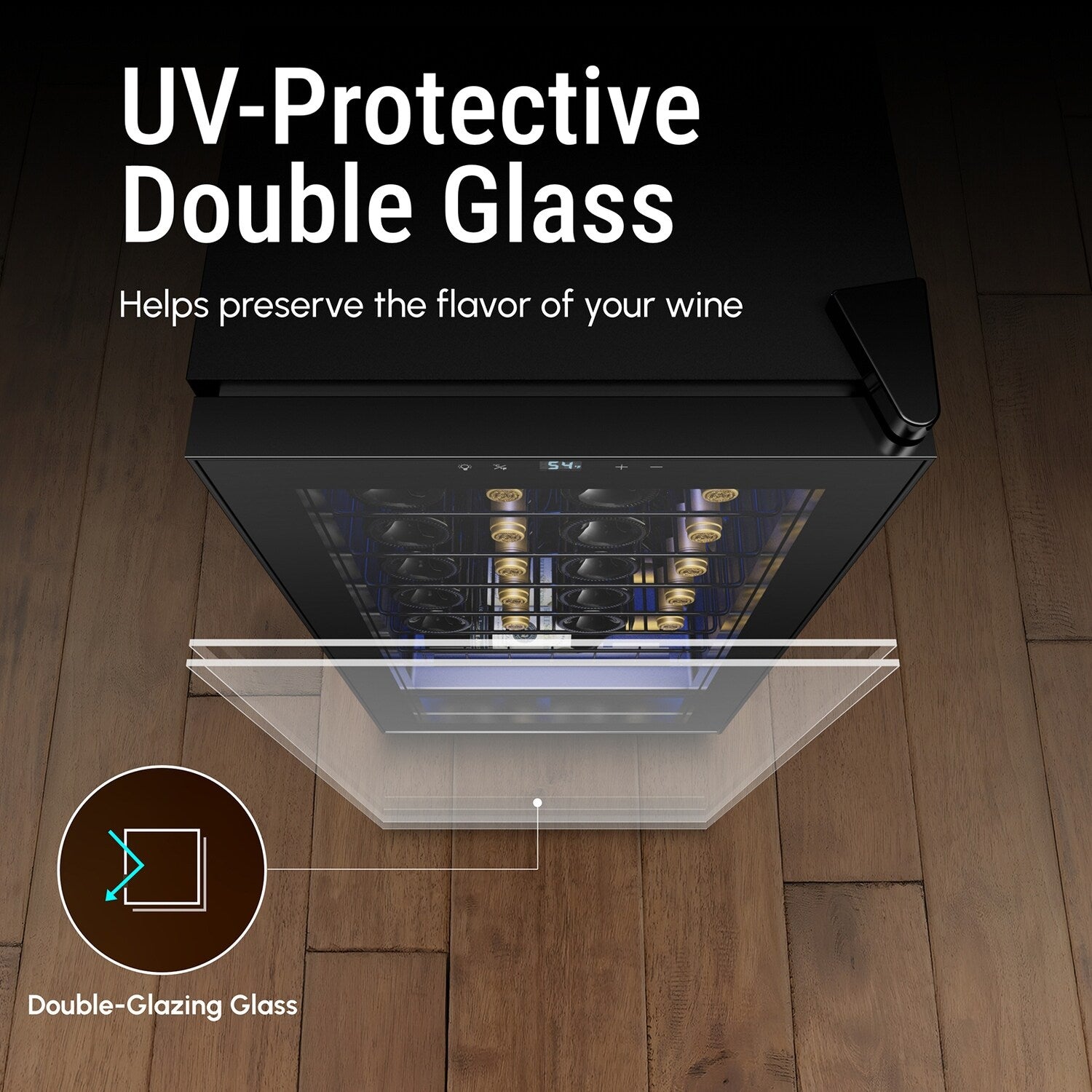 • Preserva la qualità del tuo vino con la nostra porta in vetro a doppio vetro con protezione UV. Questa caratteristica blocca i dannosi raggi UV, garantendo che il tuo vino mantenga il suo gusto e aroma perfetti.