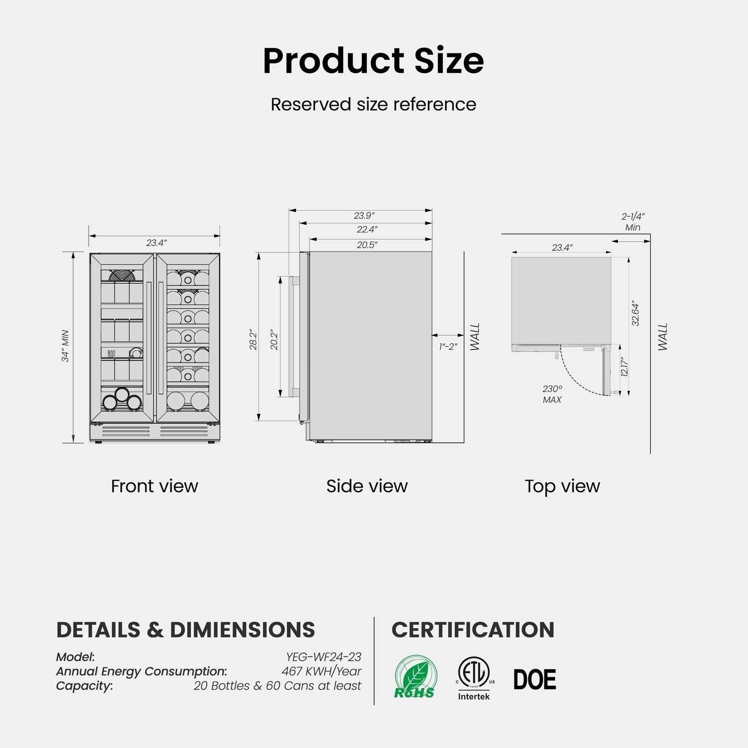 Frigorifero per vino/bevande da 24 pollici, frigorifero DUAL ZONE da 20 bottiglie/60 lattine - 24 pollici