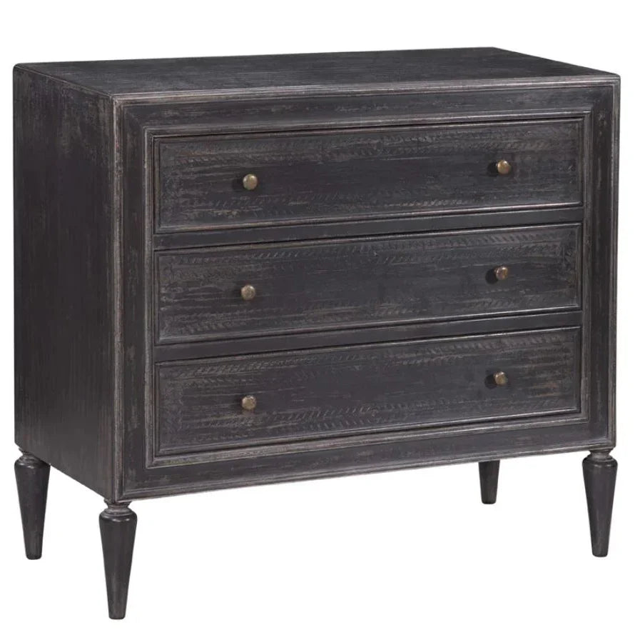 Questa cassettiera incisa in stile veneziano nero sfoggia un fascino rustico con la sua finitura anticata e il design senza tempo. Con tre ampi cassetti, pomelli classici e gambe affusolate, offre stile e funzionalità, perfetta per aggiungere carattere e spazio a una camera da letto, un corridoio o un ingresso.