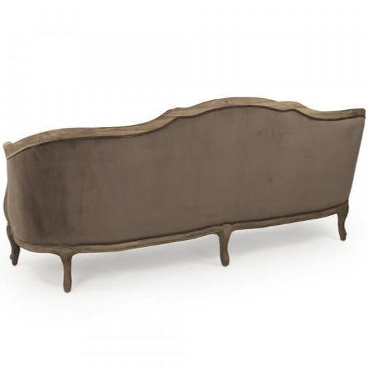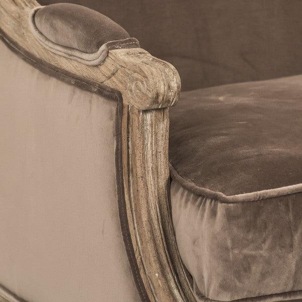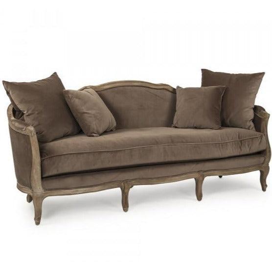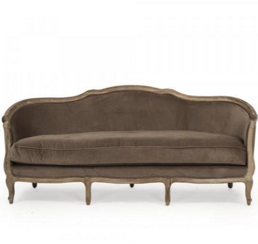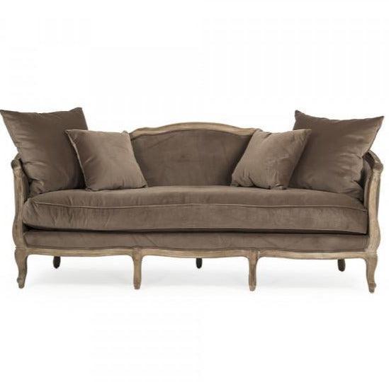 Il divano Maison in velluto marrone presenta una struttura in legno finemente lavorata che circonda lo schienale e i braccioli dalle linee sinuose. Una finitura grigio-marrone slavato mette in risalto le gambe e la struttura intagliate, mentre la cucitura a filo aggiunge un tocco finale al rivestimento neutro. Posiziona questo elegante divano in qualsiasi ambiente in cui si desideri una seduta comoda.