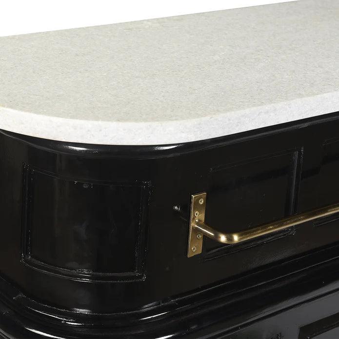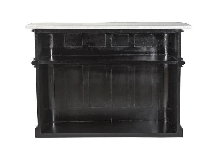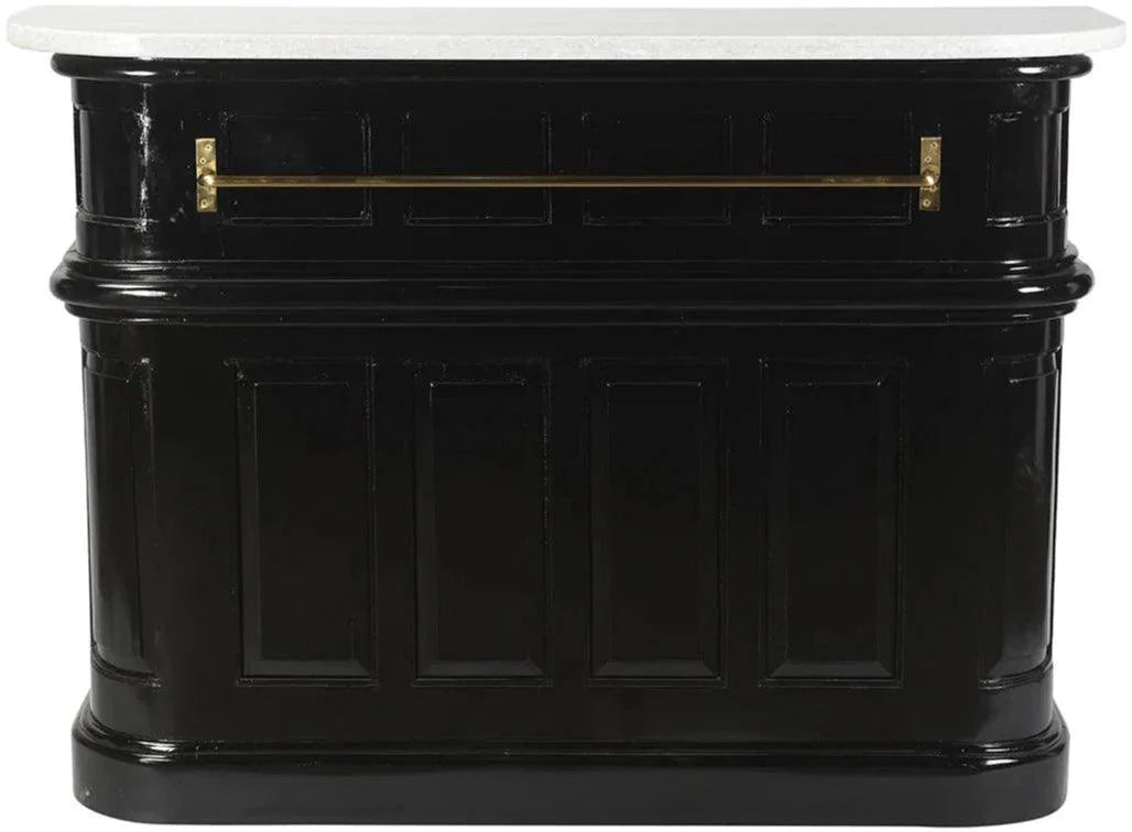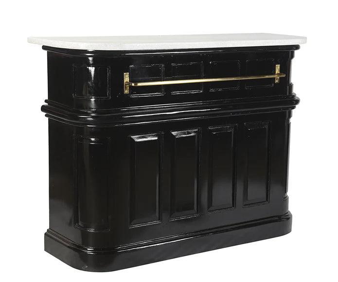 I classici pub inglesi ispirano il Black Pub Bar in bianco e nero di ispirazione europea. La base in legno è semplice ma decorativamente incastonata e verniciata di nero lucido. È ulteriormente impreziosita da una ringhiera in ottone lungo la parte anteriore. Il bancone è poi sormontato da un brillante piano in marmo bianco. Dietro il bancone si trovano ripiani per liquori e bicchieri.