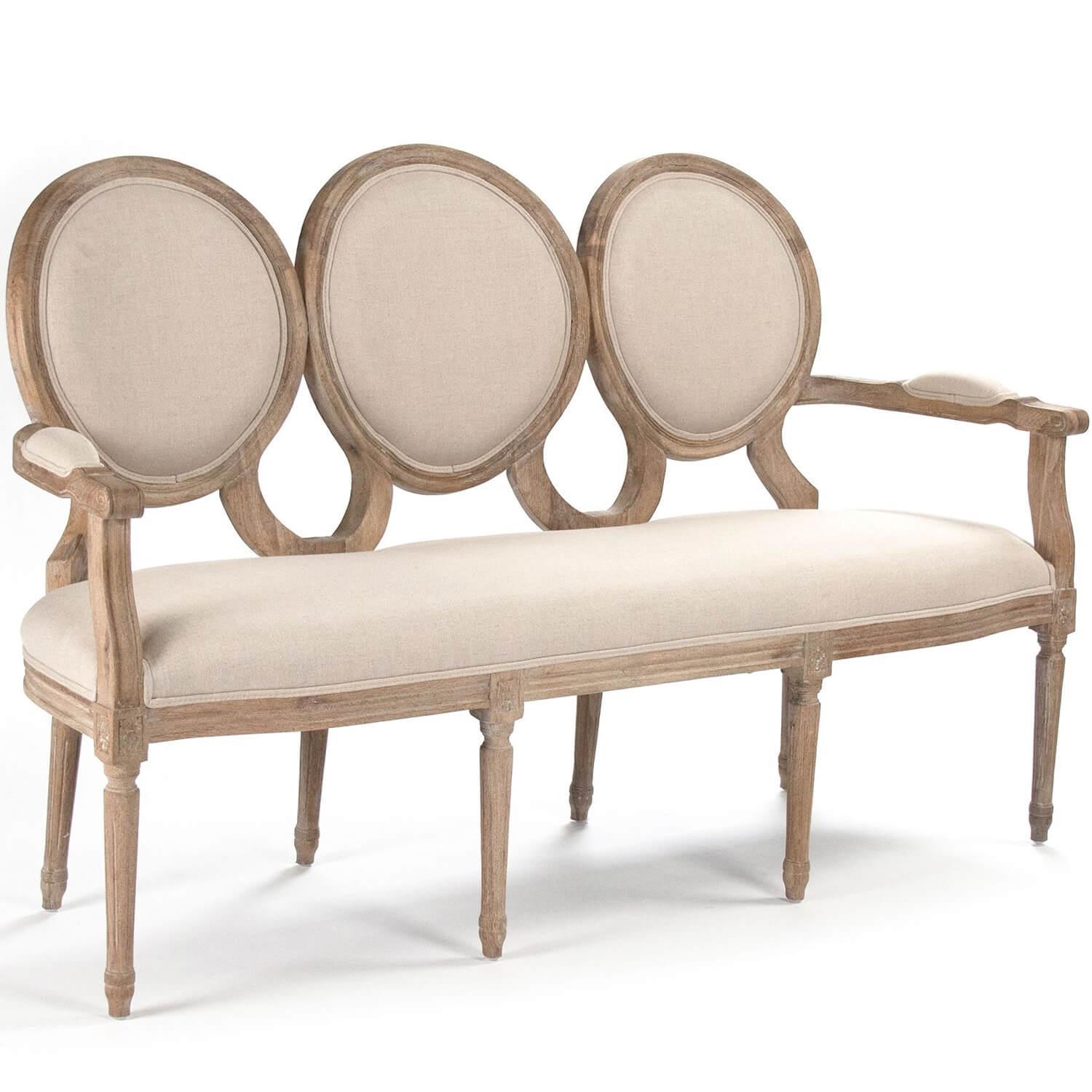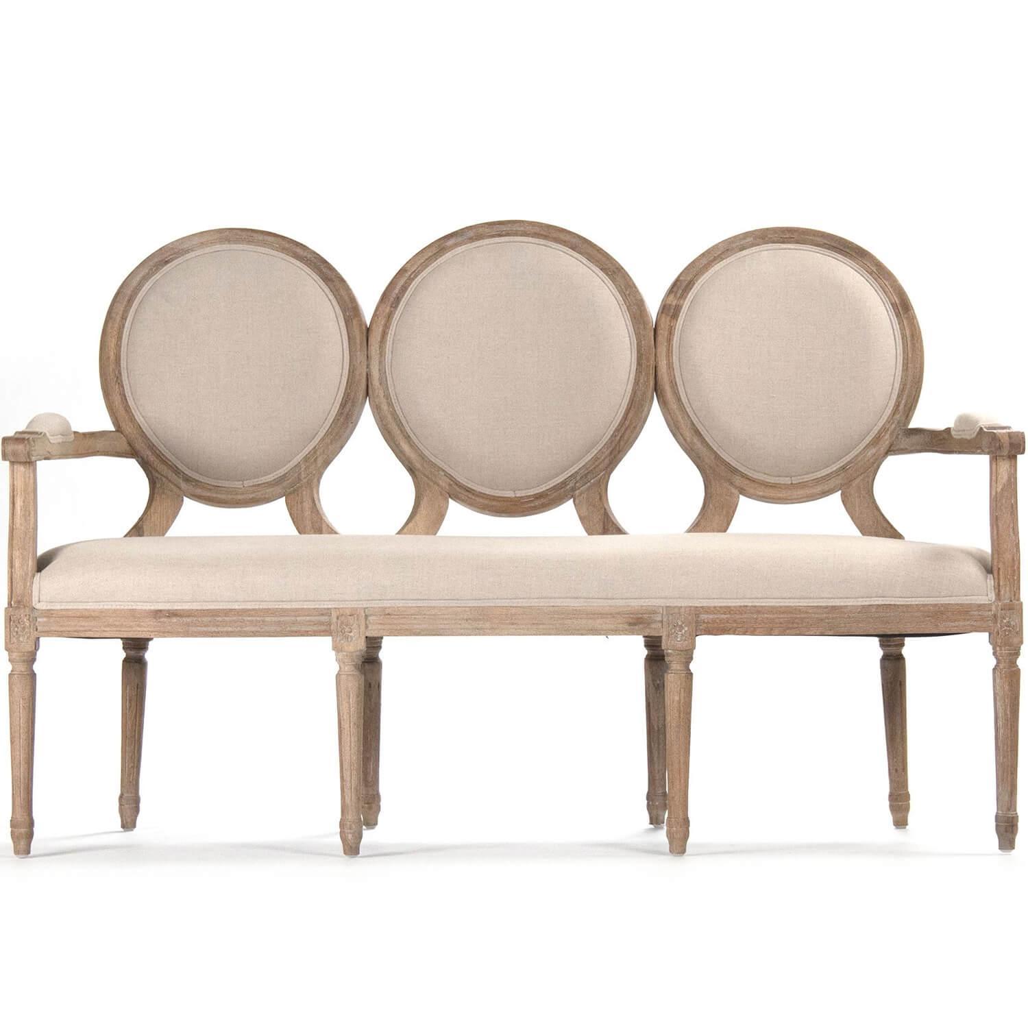Una tradizionale sedia con schienale a medaglione rivisitata in uno splendido divano. Il tessuto in lino naturale e la struttura in rovere leggermente anticato gli conferiscono un tocco vintage. Le splendide curve sulla parte superiore del divano lasciano spazio alle linee dritte e formali delle gambe. Una combinazione impeccabile.