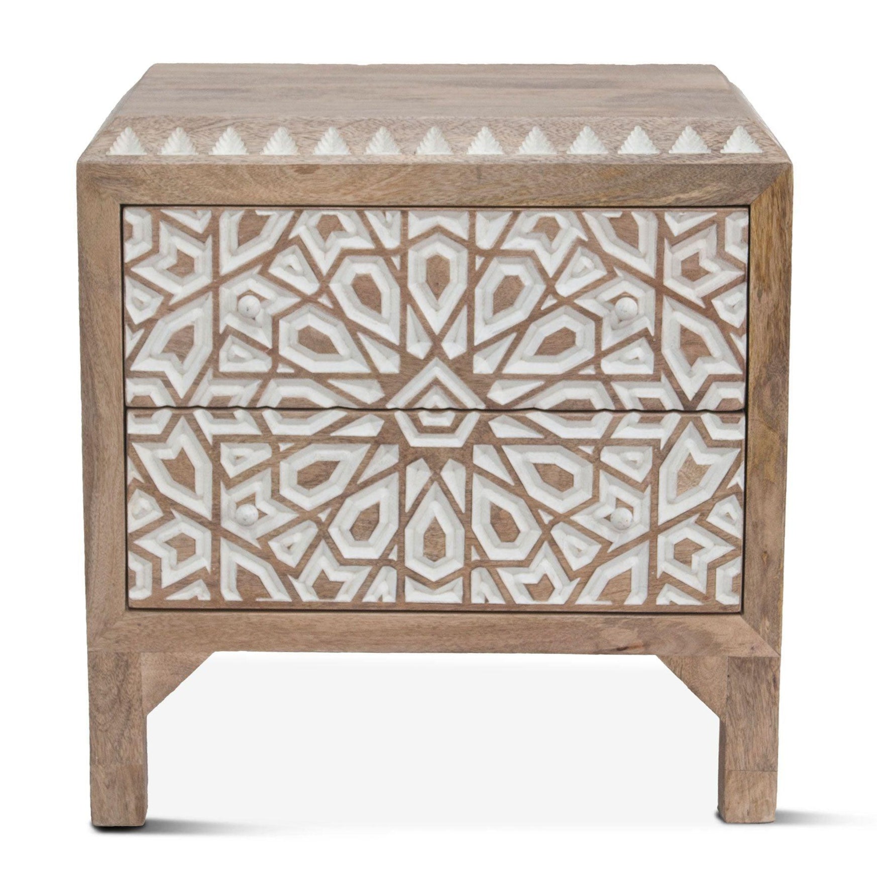 Ispirato alla cultura e all'architettura indiana, il comodino Indy Boho Natural White è realizzato in legno di mango sostenibile, con una finitura delicata che esalta la bellezza di ogni pezzo. Questa collezione presenta gambe squadrate e straordinari dettagli geometrici intagliati a mano nel legno dai nostri artigiani altamente qualificati, creando un effetto di grande impatto visivo.