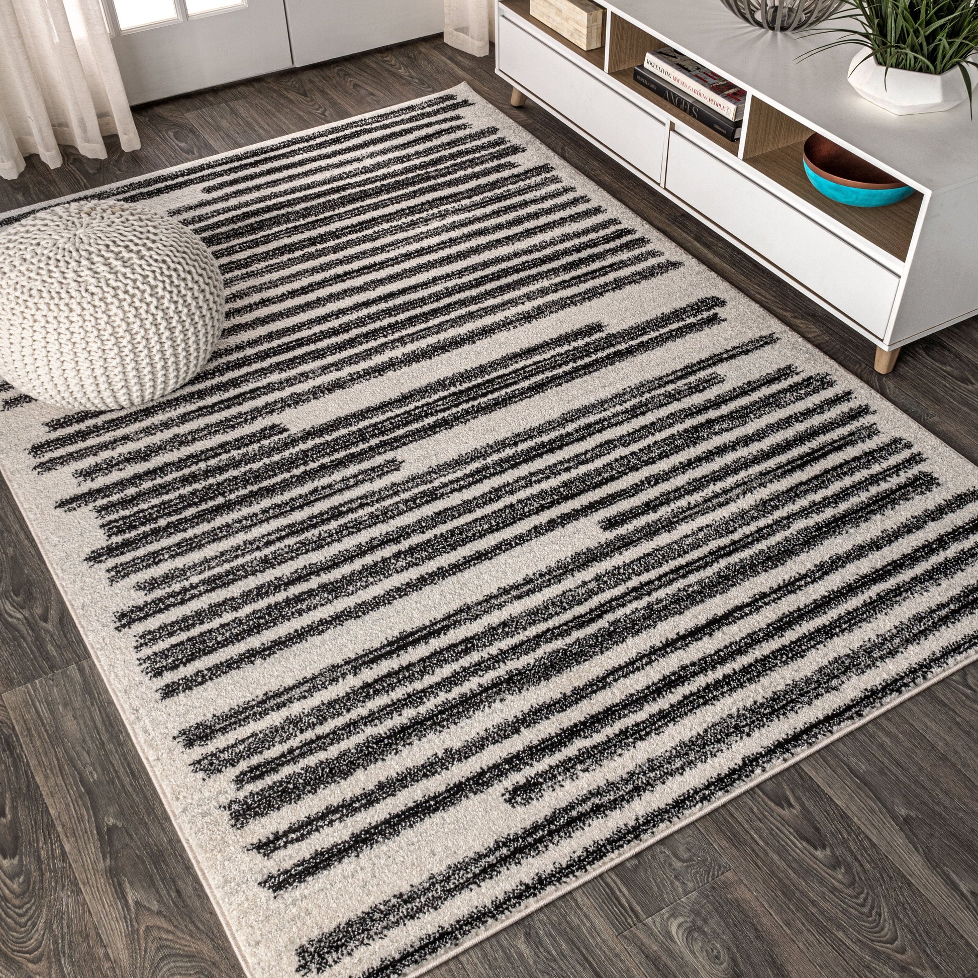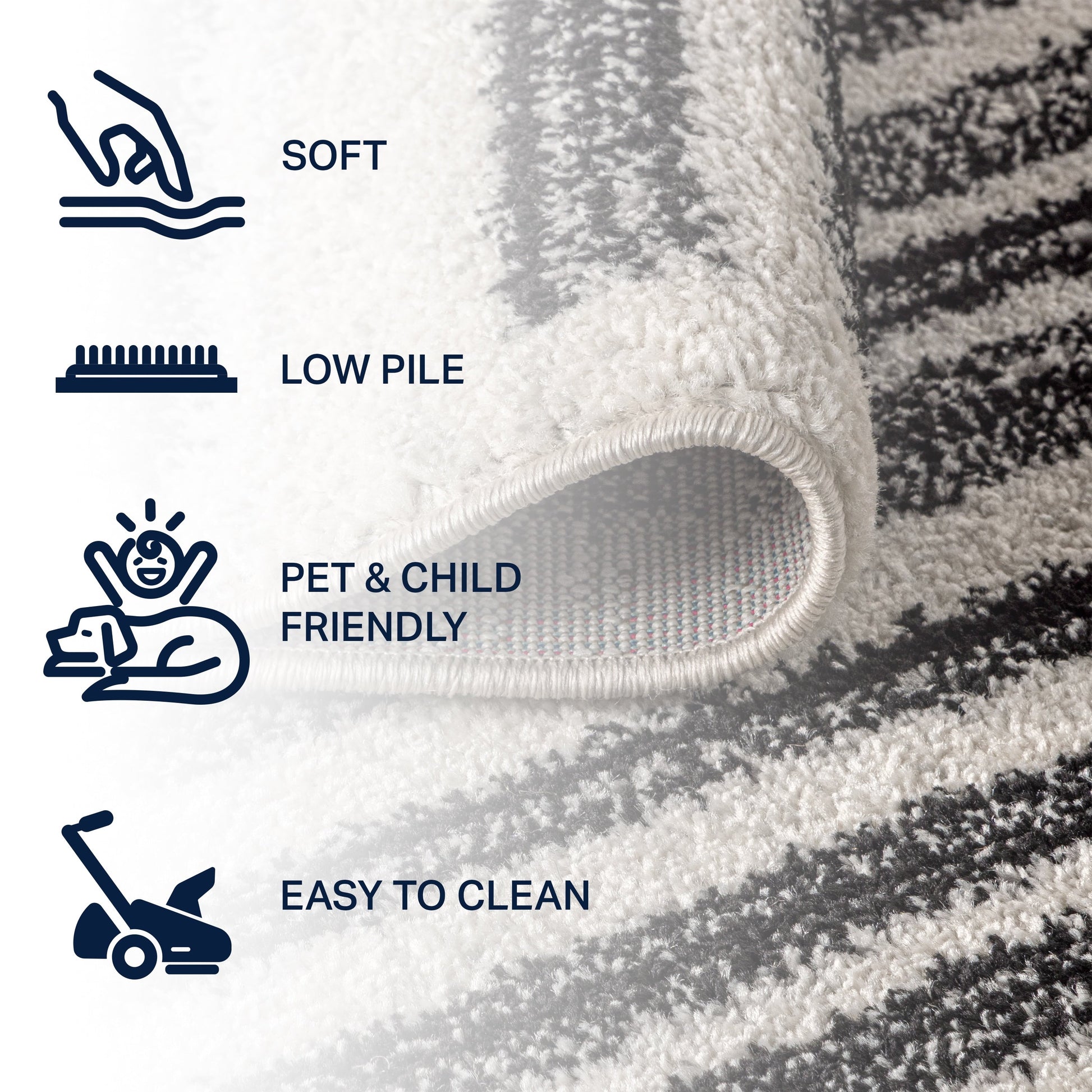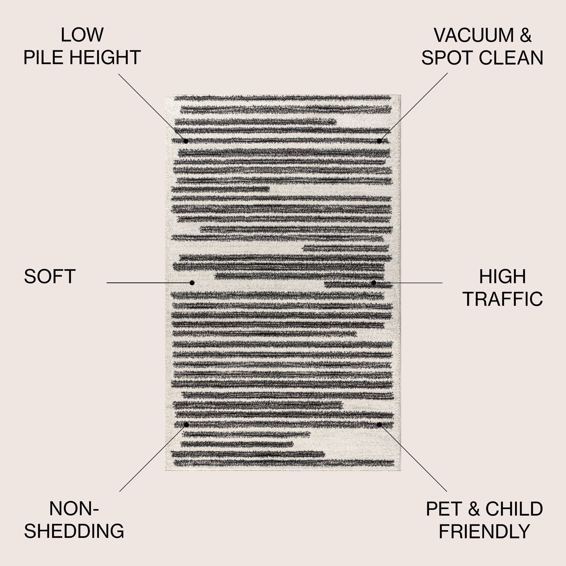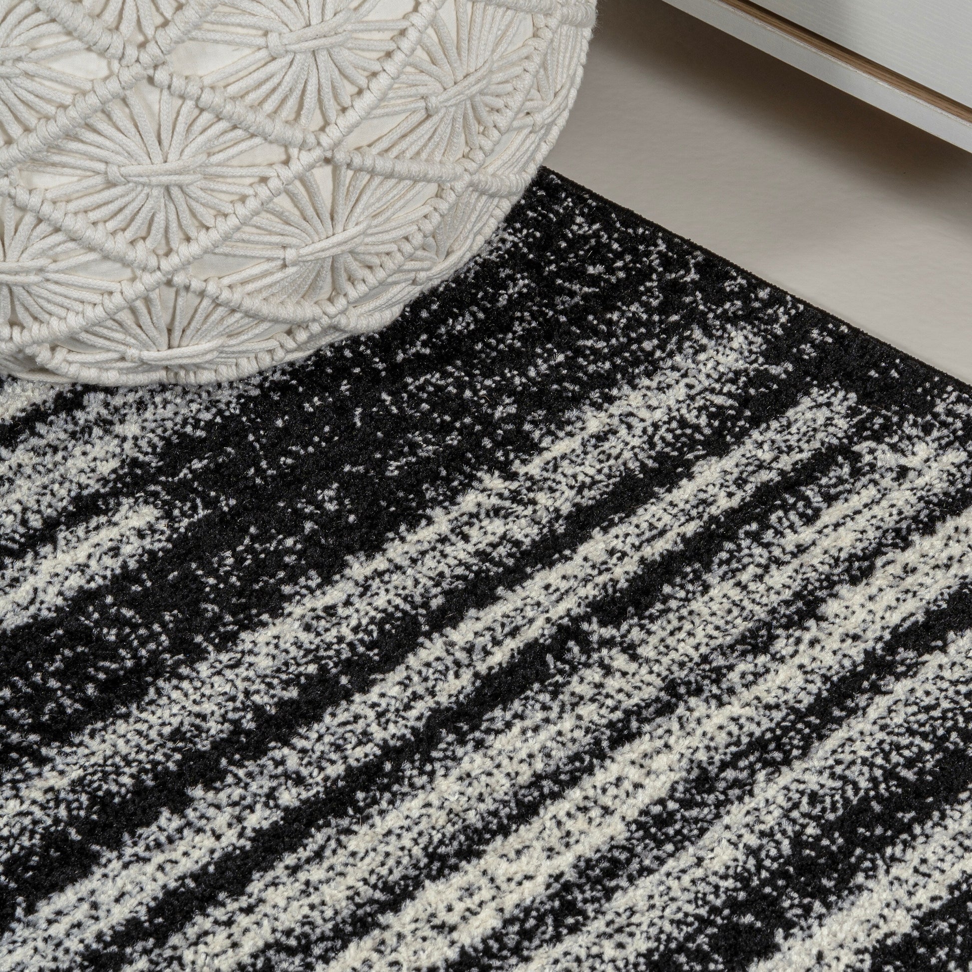 Ispirato ai tappeti marocchini d'epoca, il nostro moderno tappeto a righe è realizzato con telaio meccanico a pelo corto. Il motivo a righe e barre sfalsate è tessuto in nero su sfondo avorio; i fili intrecciati ricordano i tradizionali tappeti tessuti a mano. Aggiungi un tocco di stile anni '50 alla tua casa con questo tappeto di facile manutenzione.
