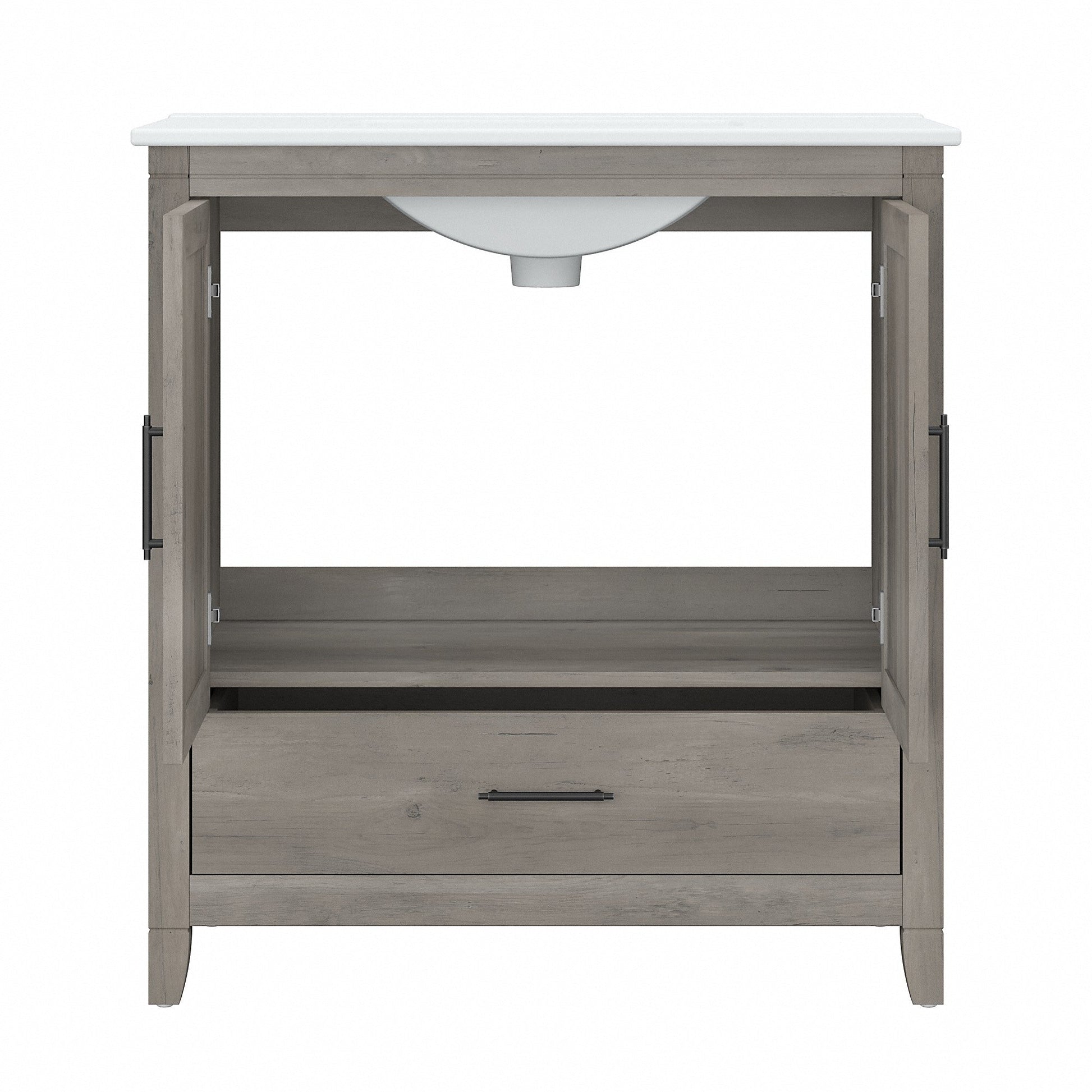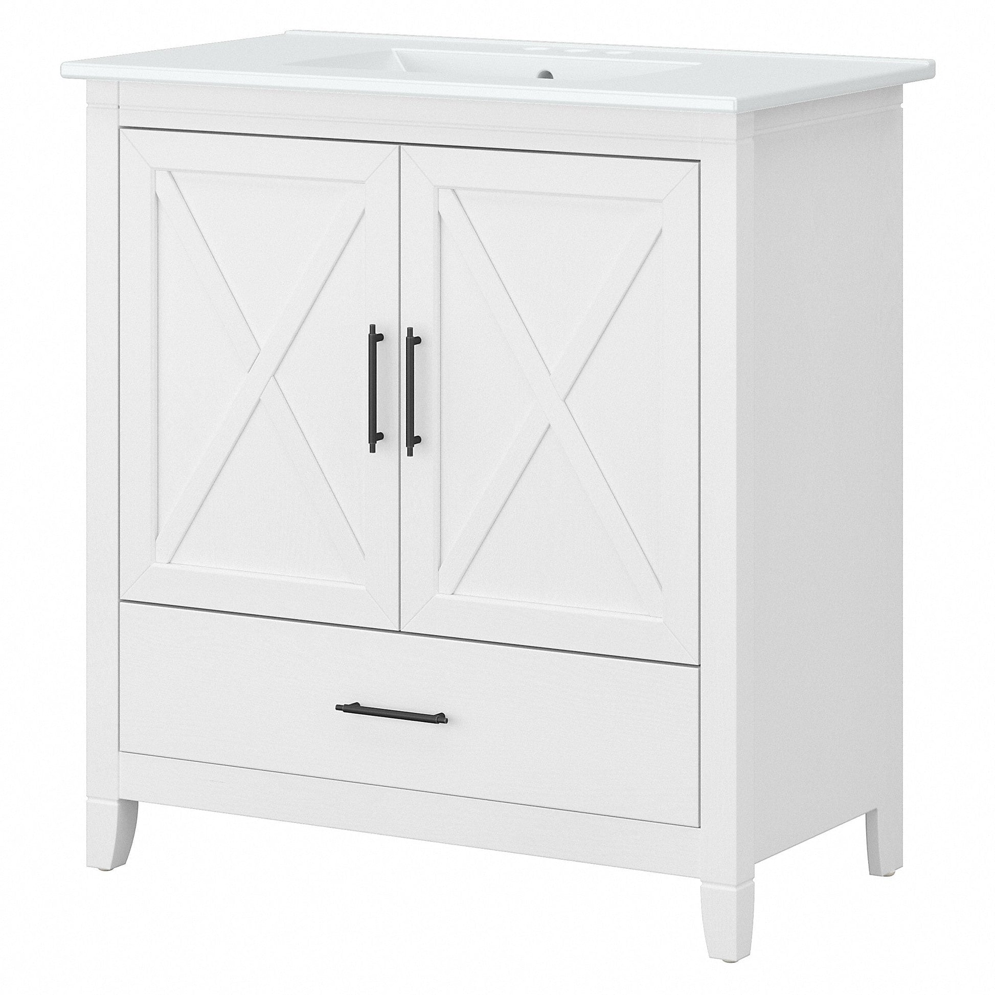 Il mobile bagno con lavabo Bush Furniture Key West da 32 W è la soluzione perfetta per arredare la casa in autentico stile rustico. Caratterizzato da un design piacevolmente casual, questo mobile sospeso unisce un aspetto accattivante alla resistenza e alla praticità necessarie per anni di utilizzo senza problemi. Il lavabo è dotato di tre fori preforati per un rubinetto centrale da 10 cm (accessori non inclusi), un foro di troppo pieno e uno scarico da 4,5 cm. Il lavabo in ceramica bianca può essere pulito rapidamente e facilmente con una spugna morbida, acqua e detersivo. Sfrutta il cassetto e il mobiletto integrati per tenere in ordine e a portata di mano prodotti per la pulizia, asciugamani, articoli da toeletta e altri prodotti essenziali per la cura personale. Le ante sono dotate di cerniere lisce in stile europeo e di esclusivi dettagli a X che si abbinano perfettamente alle finiture Driftwood Grey e White Ash. Dotato di 1 anno di garanzia del produttore Bush Furniture, questo piccolo mobiletto per lavabo è stato rigorosamente testato per sicurezza, durata e prestazioni, mentre il lavabo a incasso soddisfa gli standard di certificazione UPC e CSA B45.1 per gli apparecchi idraulici in ceramica. Il montaggio e l'installazione sono richiesti dall'utente. Scopri la collezione completa di mobili da bagno in stile rustico di Key West per arricchirla secondo le tue esigenze con un armadietto per medicinali, un mobiletto a muro, un mobiletto sopra il WC, un mobiletto alto per il bagno e un cesto portabiancheria con coperchio e fodera rimovibile (articoli coordinati venduti separatamente).