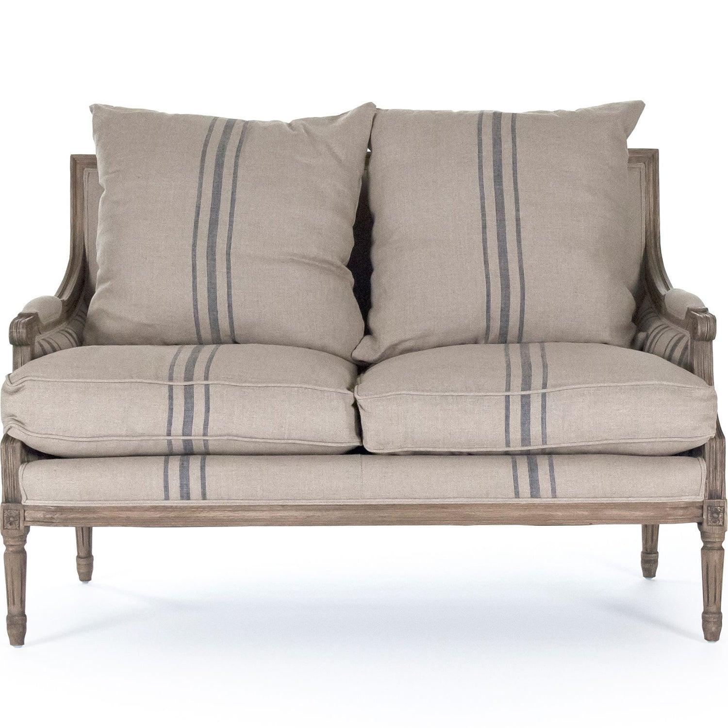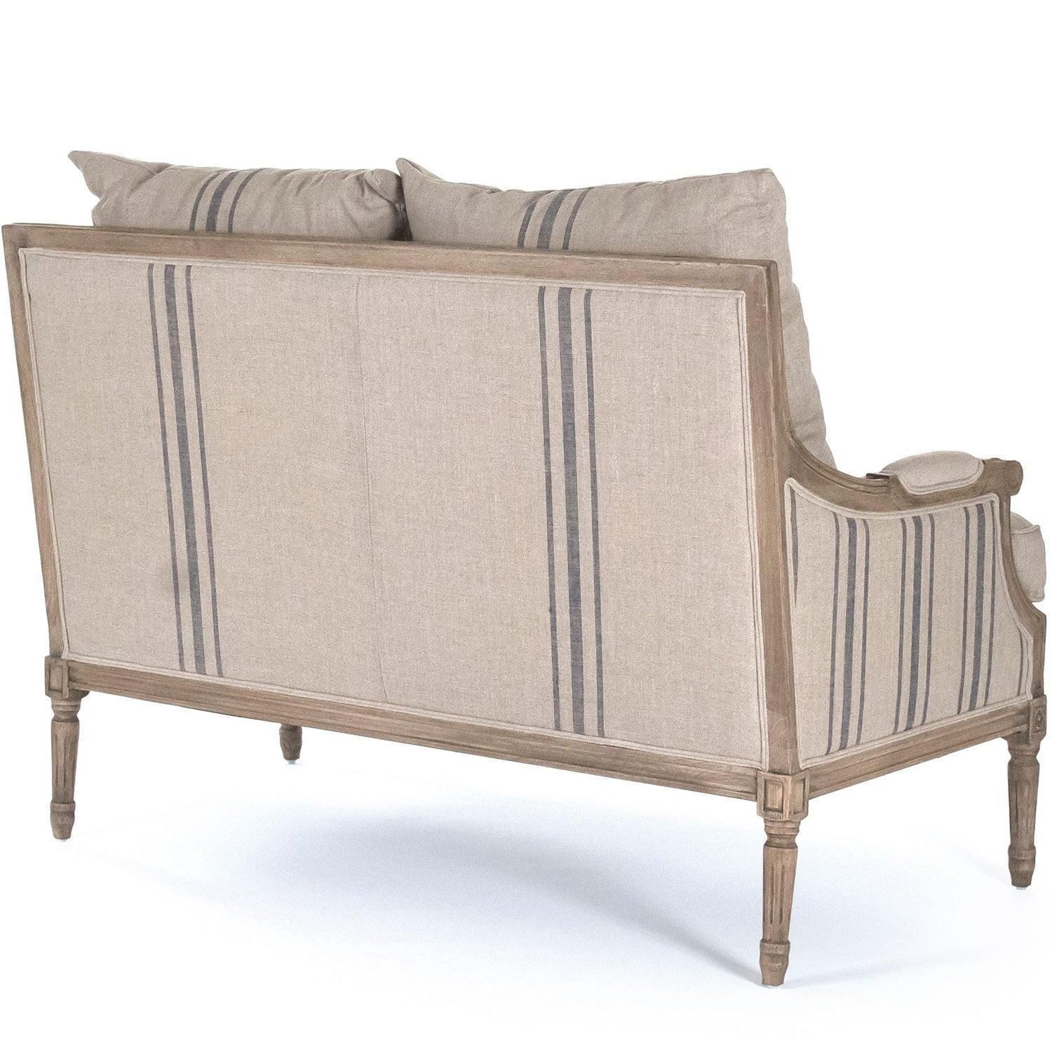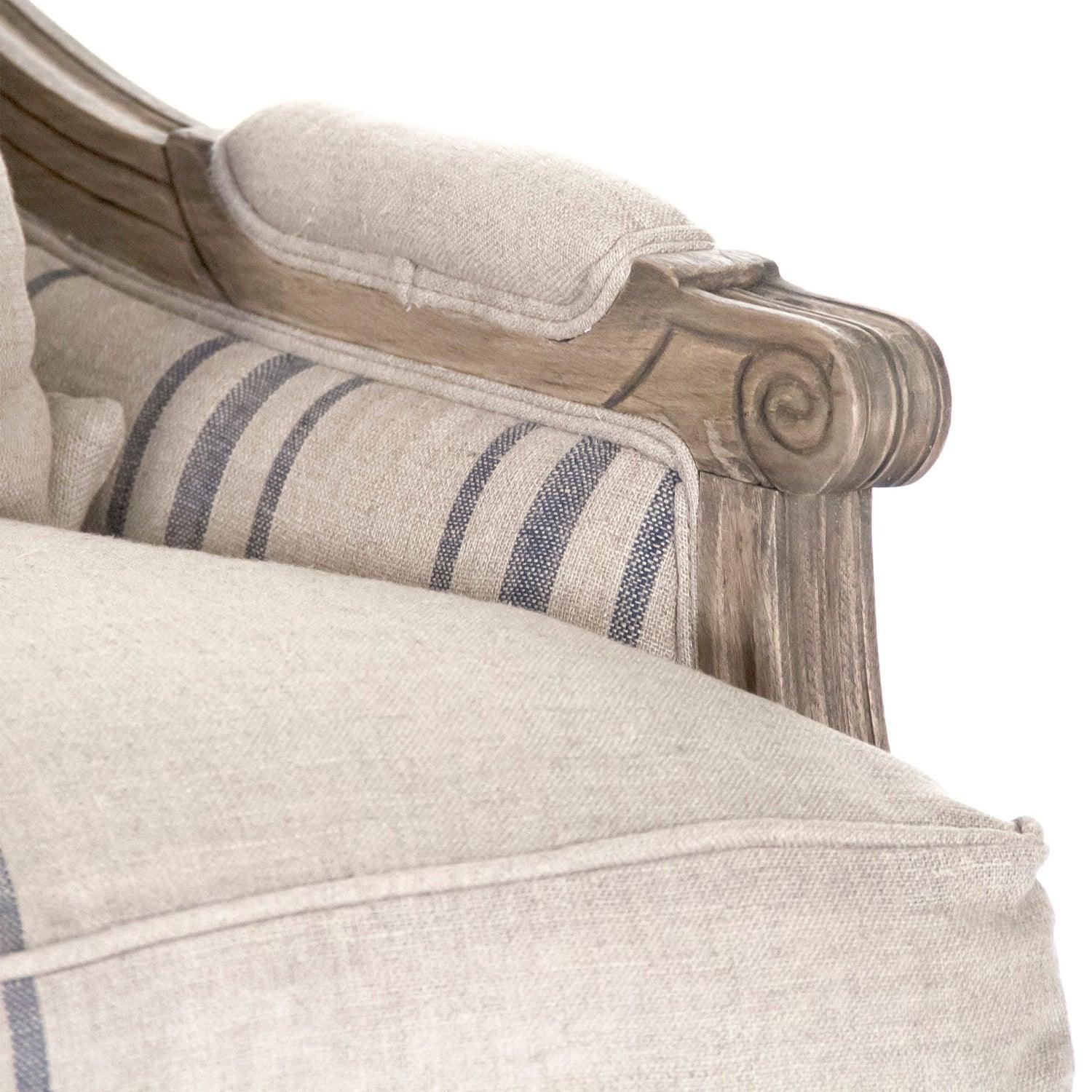 Caratteristiche: • Realizzato in legno di quercia • Tessuto di lino naturale • Finitura in rovere riciclato invecchiato • Strisce blu • Altezza seduta: 21'; Altezza bracciolo: 25' • Due cuscini posteriori: 24' x 24' ciascuno