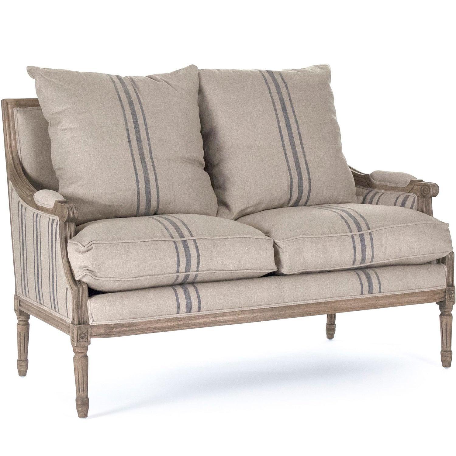 Un divano tradizionale francese realizzato con un elegante tessuto di lino naturale a righe che gli conferisce un aspetto fresco e moderno. I generosi cuscini dello schienale e i braccioli offrono un comfort ottimale, mentre la struttura in rovere intagliato a mano presenta medaglioni e un'elegante finitura anticata. Questo design audace si adatterà perfettamente al vostro arredamento in stile francese o cottage.
