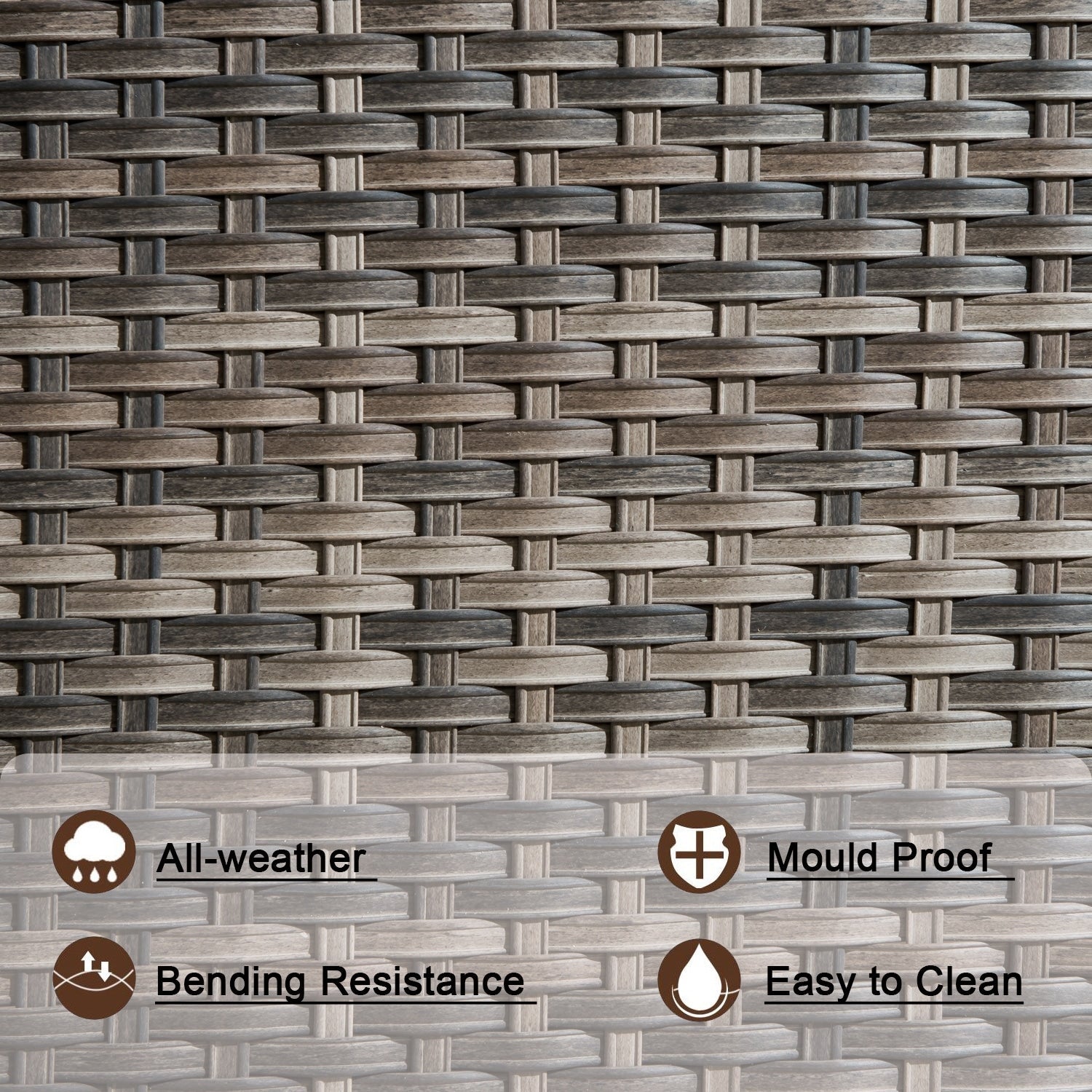 Design in vimini resistente: la robusta struttura in vimini, resistente alle intemperie, garantisce una lunga durata, resistenza allo sbiadimento e ai danni causati dagli agenti atmosferici. Questo set è costruito per resistere alle condizioni esterne per anni a venire.