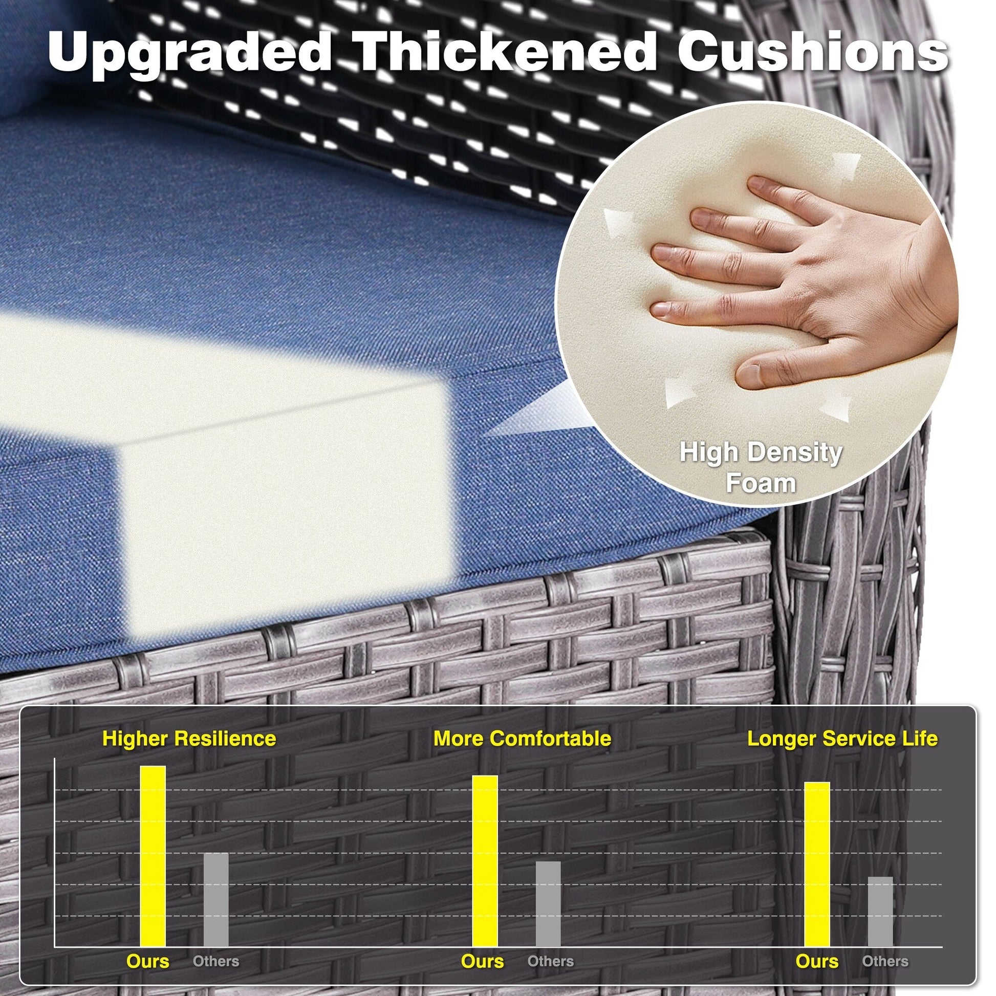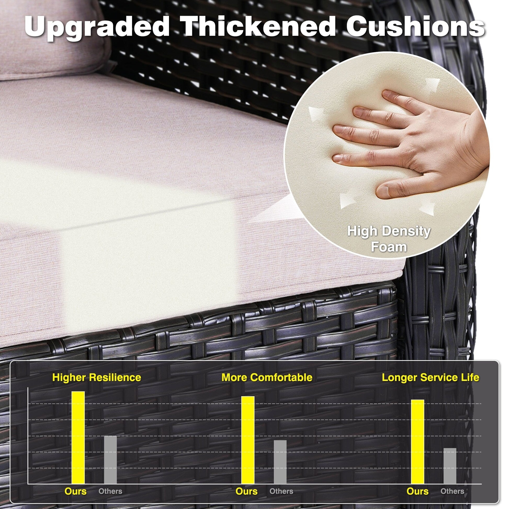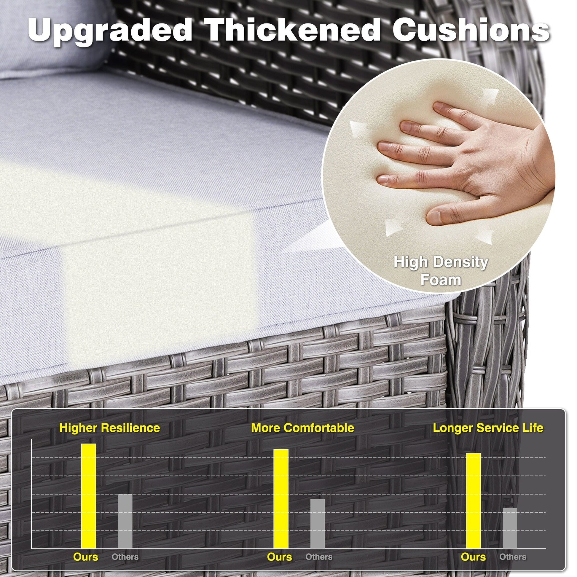 Crea un'oasi all'aperto con il set di mobili da giardino in vimini OVIOS da 5 pezzi. Questo set include due poltrone, un divano e due pouf, tutti realizzati in rattan PE di qualità commerciale, resistente alle intemperie e di lunga durata. Gli spessi cuscini di seduta in spugna offrono comfort e relax, mentre gli schienali alti e i braccioli curvi offrono un supporto ergonomico. Dotato di coperture impermeabili facili da pulire, questo set è perfetto per qualsiasi patio, veranda, bordo piscina o giardino. Scegli tra diversi colori per abbinarli al tuo stile e valorizzare il tuo spazio esterno.