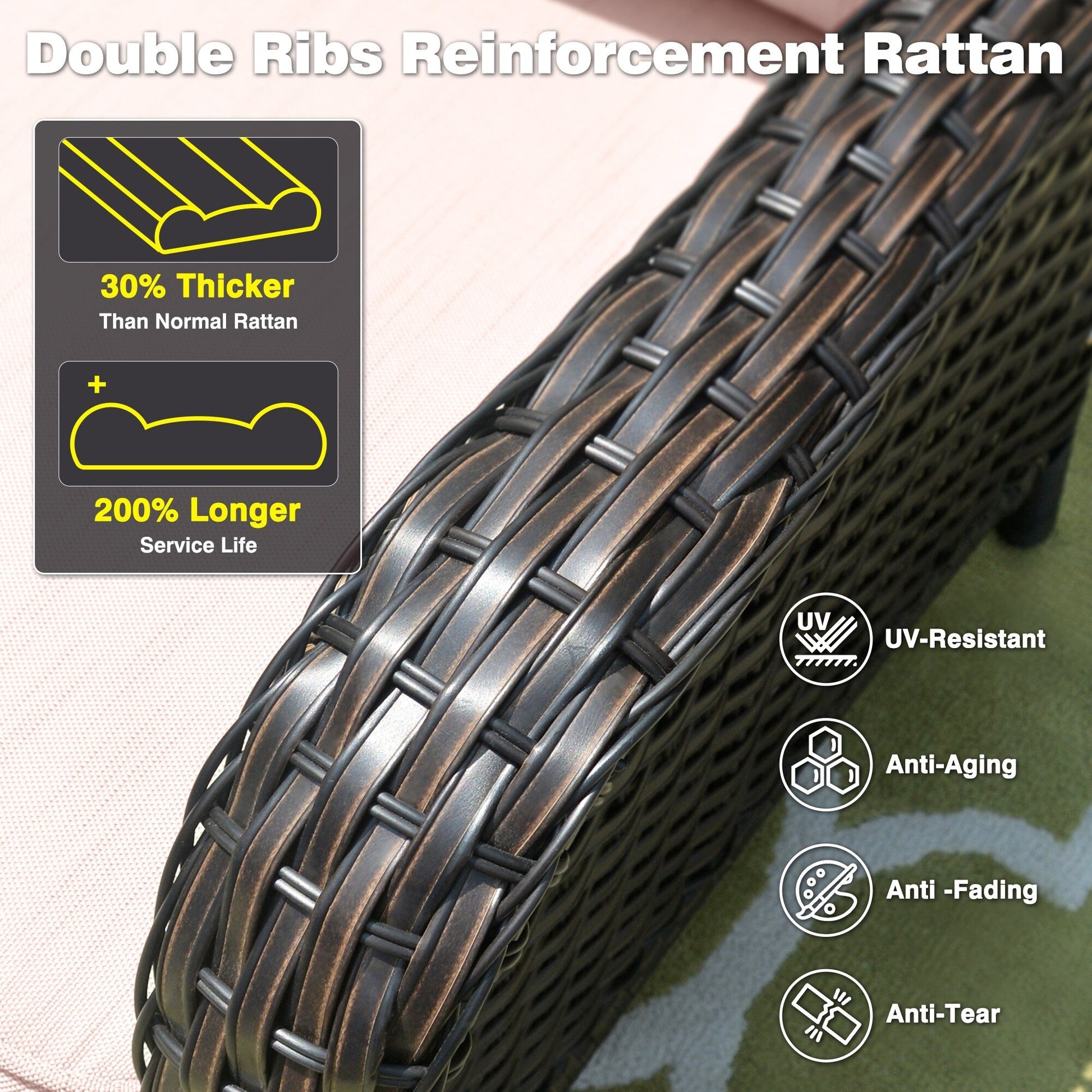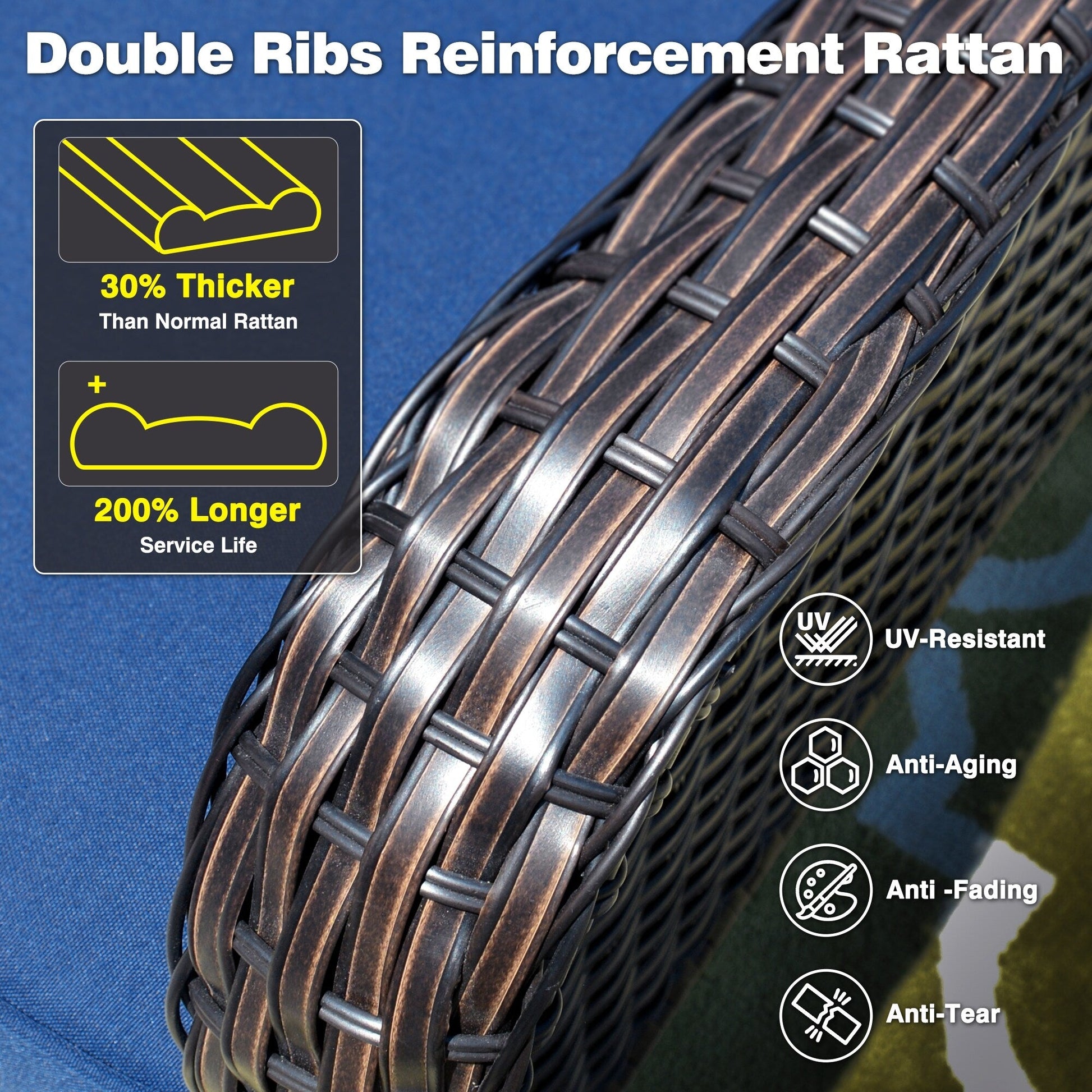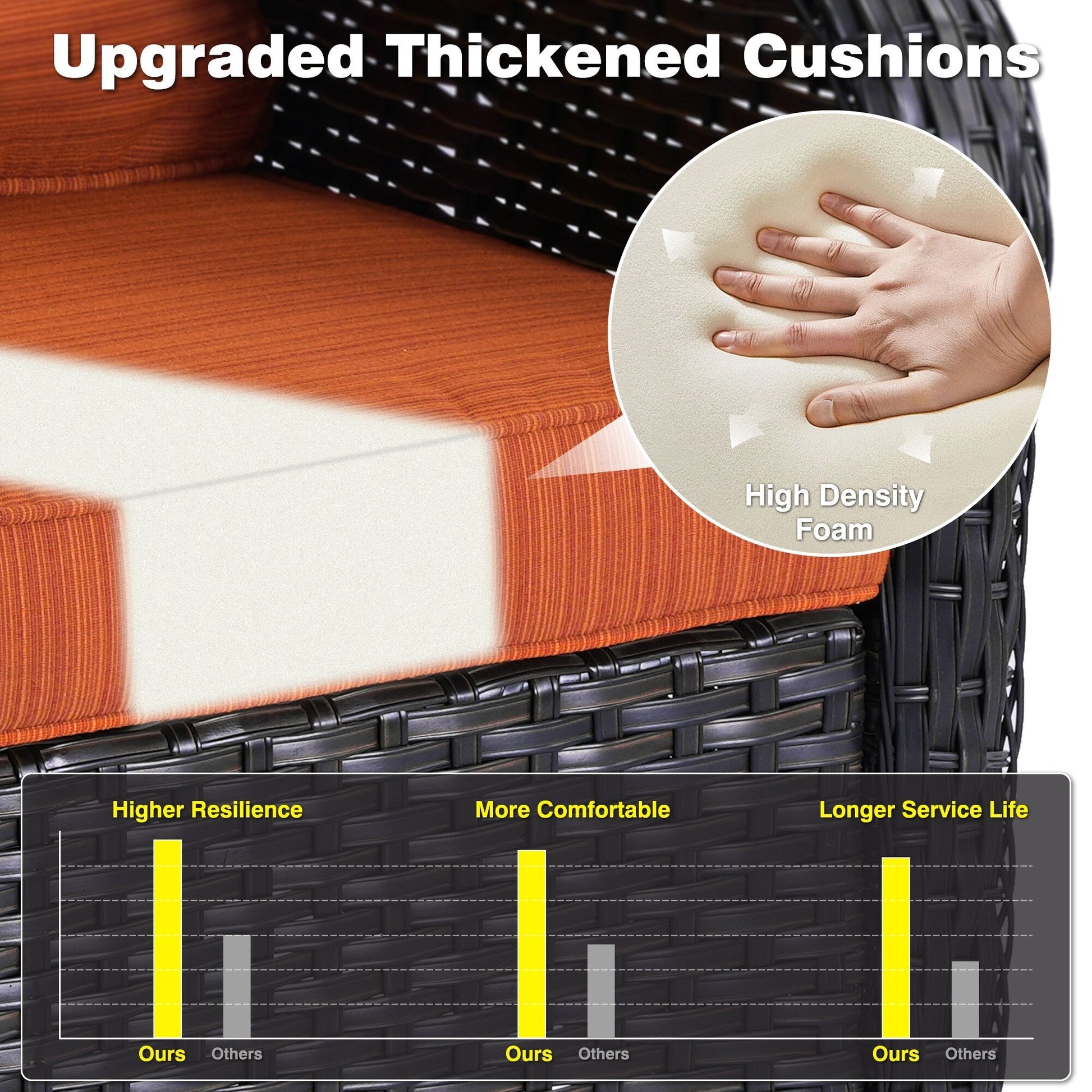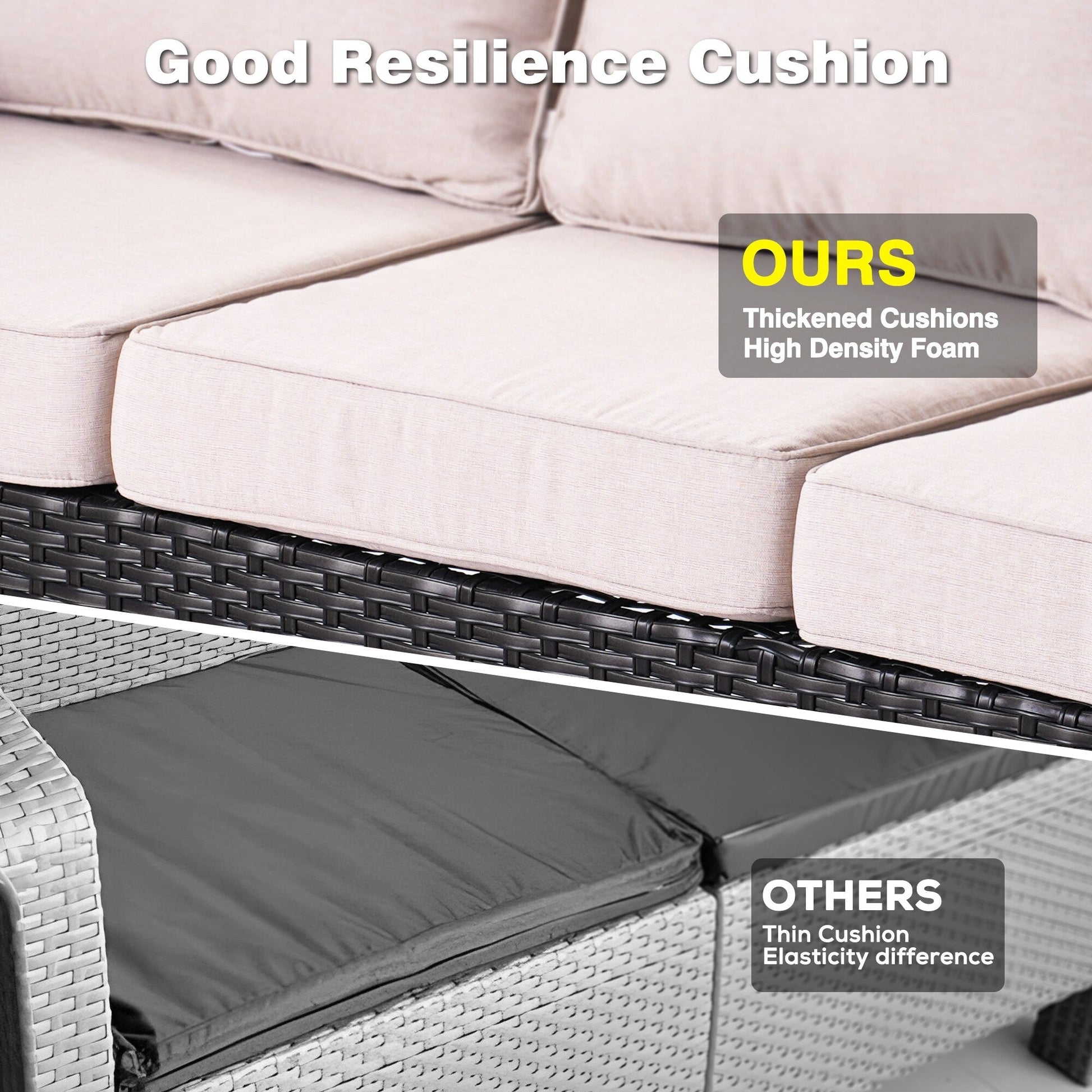 Crea un'oasi all'aperto con il set di mobili da giardino in vimini OVIOS da 5 pezzi. Questo set include due poltrone, un divano e due pouf, tutti realizzati in rattan PE di qualità commerciale, resistente alle intemperie e di lunga durata. Gli spessi cuscini di seduta in spugna offrono comfort e relax, mentre gli schienali alti e i braccioli curvi offrono un supporto ergonomico. Dotato di coperture impermeabili facili da pulire, questo set è perfetto per qualsiasi patio, veranda, bordo piscina o giardino. Scegli tra diversi colori per abbinarli al tuo stile e valorizzare il tuo spazio esterno.