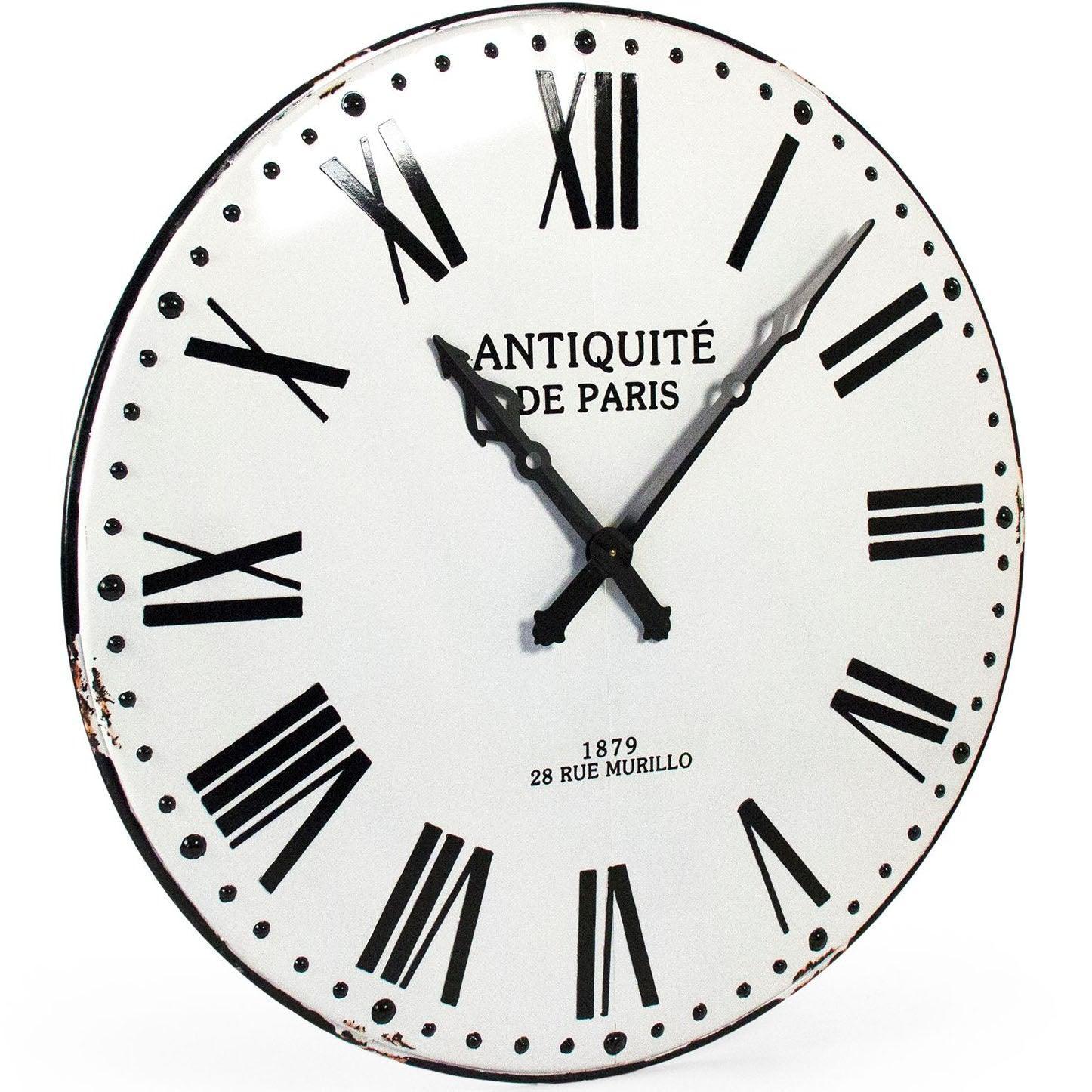 Un orologio dalle proporzioni imponenti che non mancherà di stupire, l'orologio da parete Grand Parisian Blanc et Noir offre un fascino vintage di grande impatto. Numeri romani neri e indici dei minuti dipinti ne impreziosiscono la superficie. Le lancette scolpite scandiscono il tempo in modo affidabile e il testo in francese aggiunge un tocco estroso. Leggermente anticato lungo i bordi, questo splendido orologio è realizzato in ferro per un'eleganza duratura.